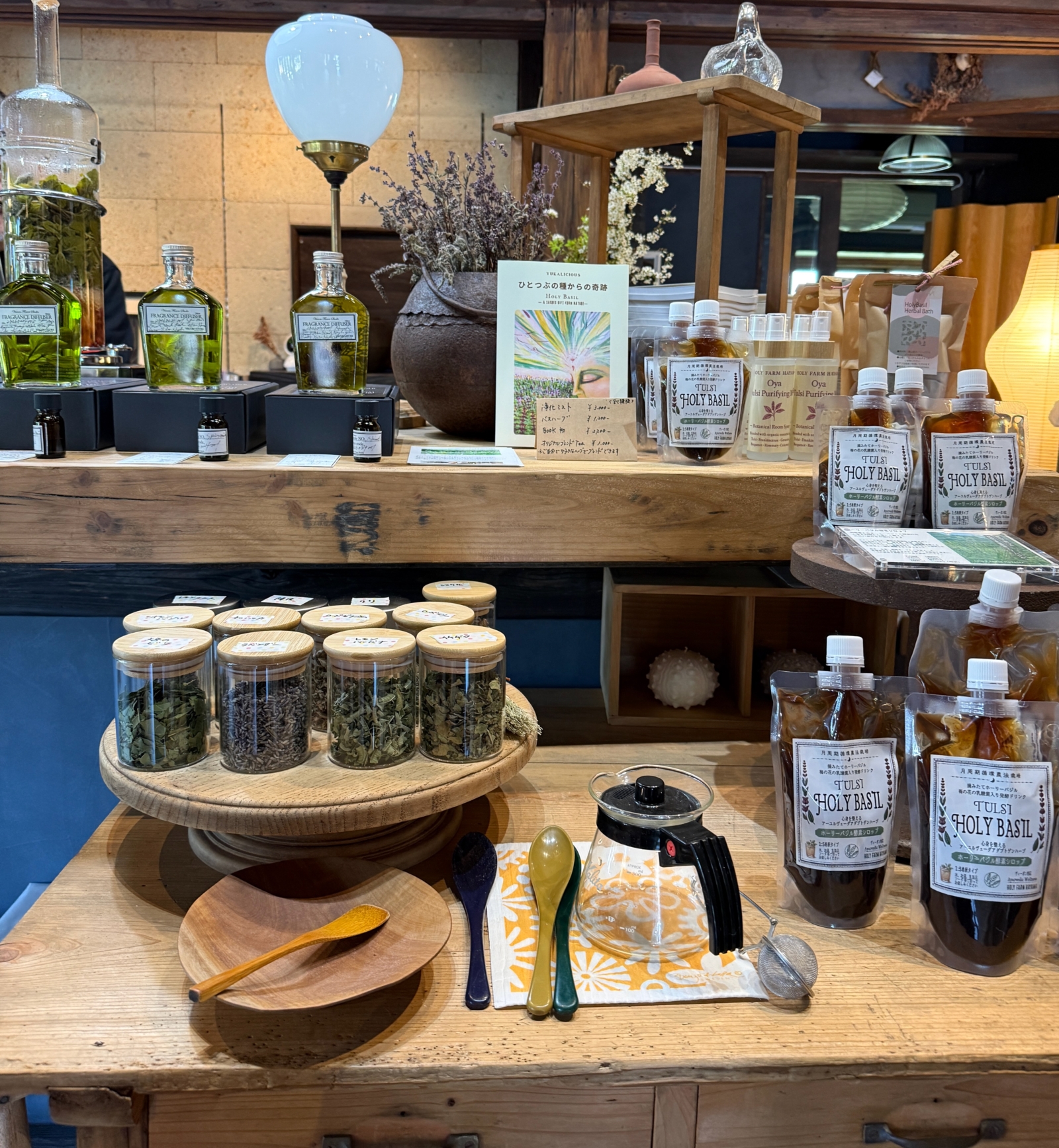 蒸留の香りとホーリーバジルの香りが調和し、凛とした空気に包まれたgullam.lfie&artsの店内。