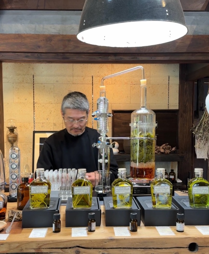 店内は季節の草木(今回はオーデコロンミントとローズマリー)で蒸留を行い、