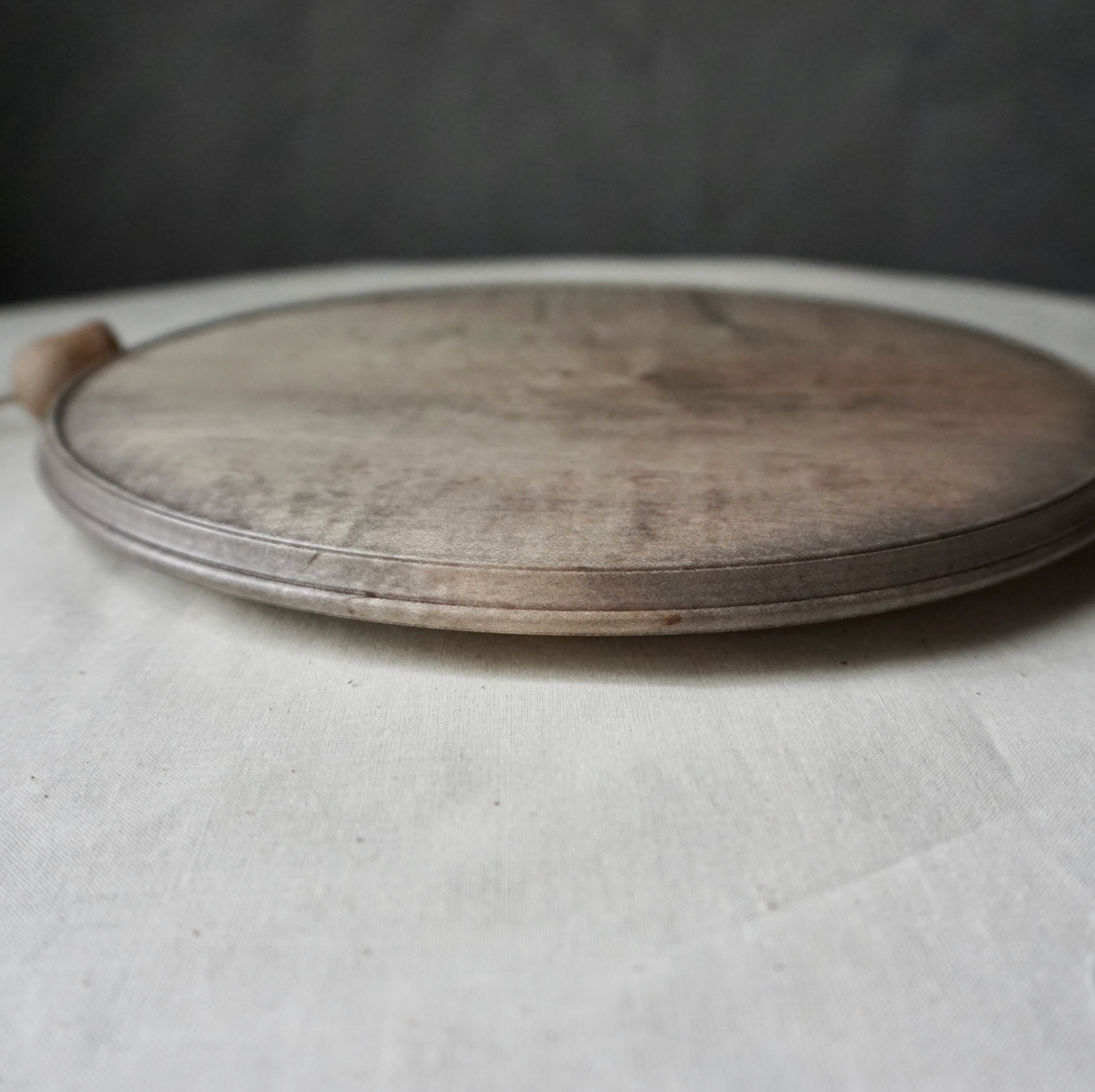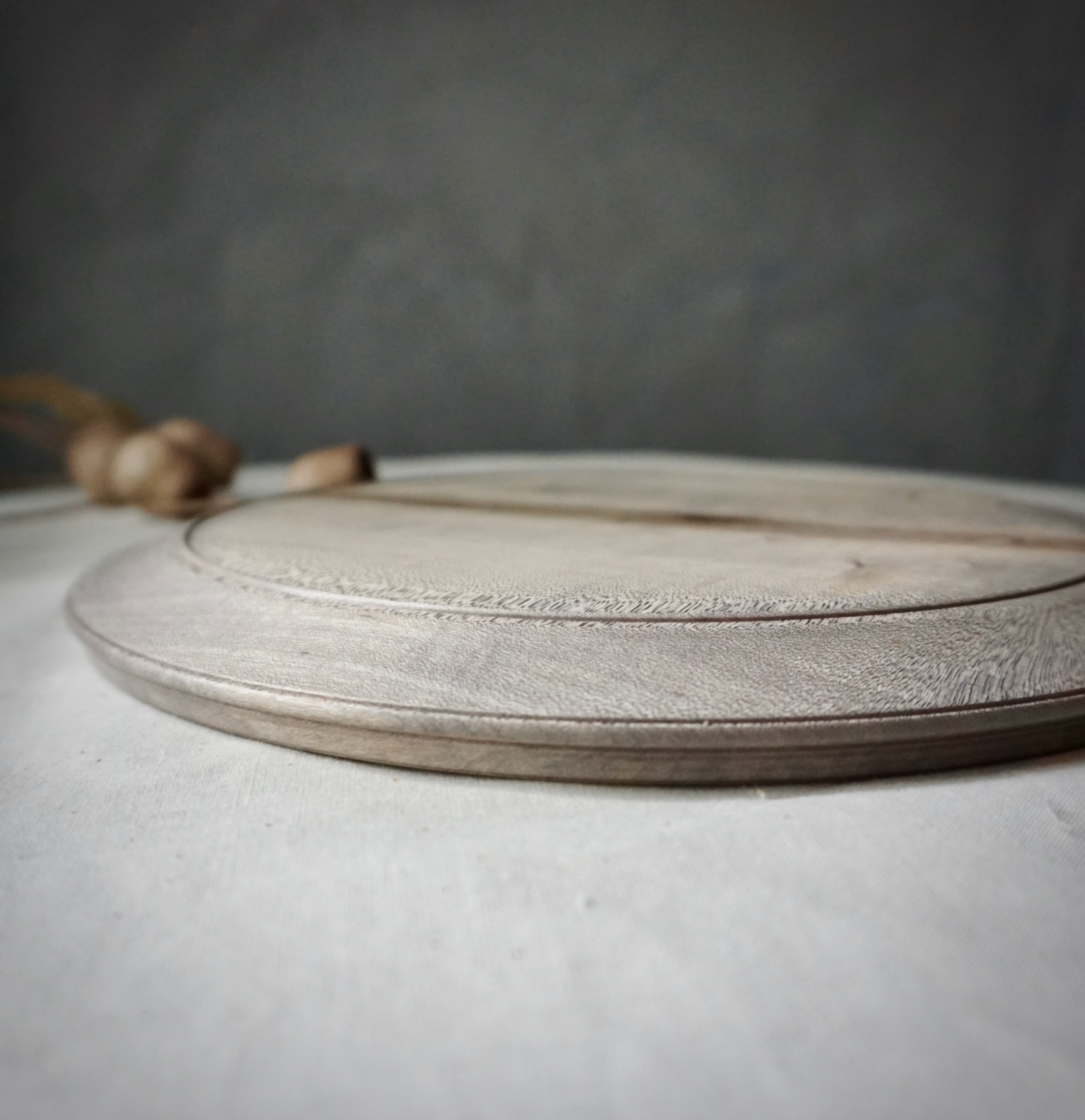 縁には凹凸をつけるモールディング加工が幾重も施されており、立体感や質感が出されていて細部までの拘りが伝わる丸い形のカッティングボード。