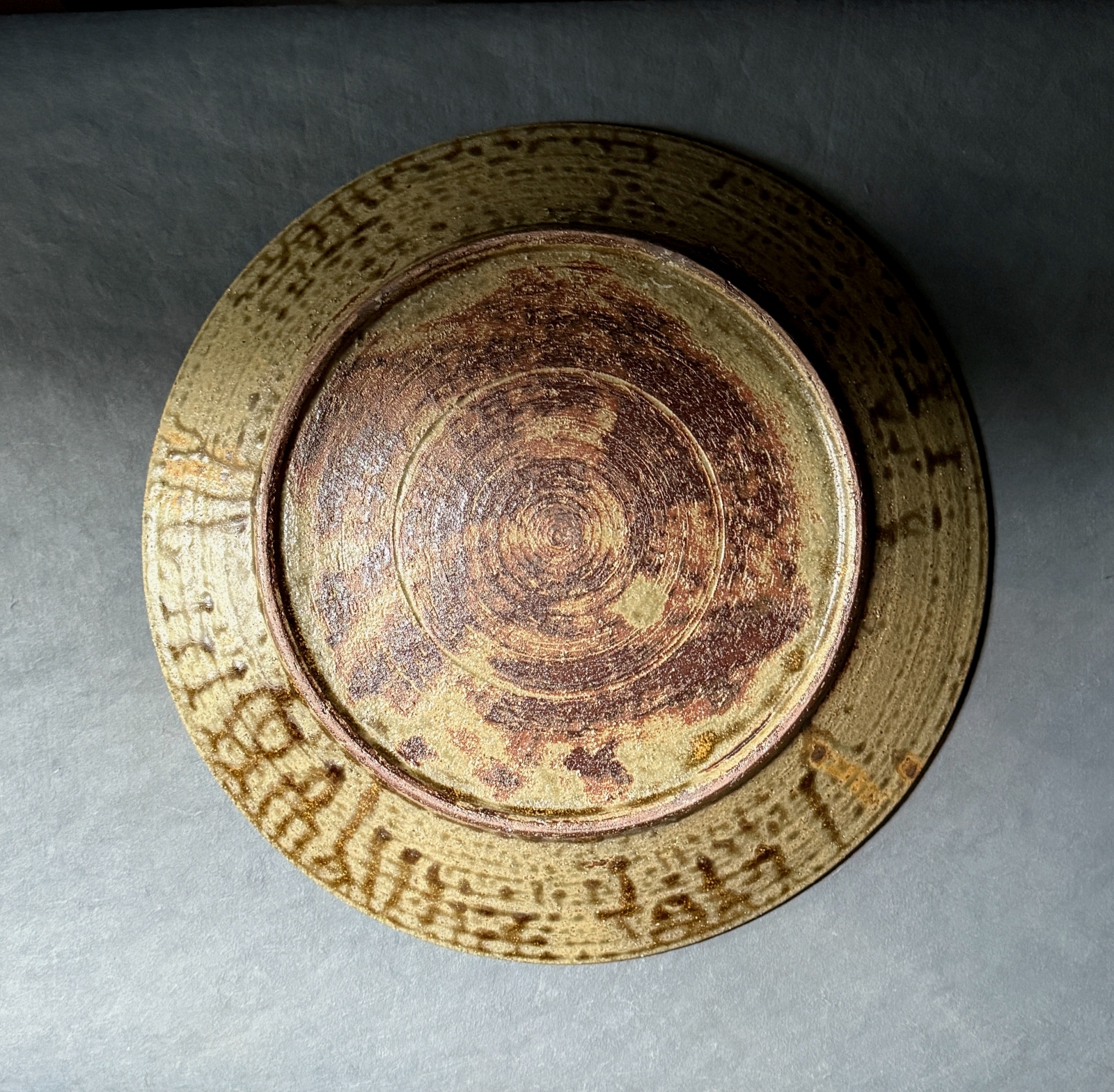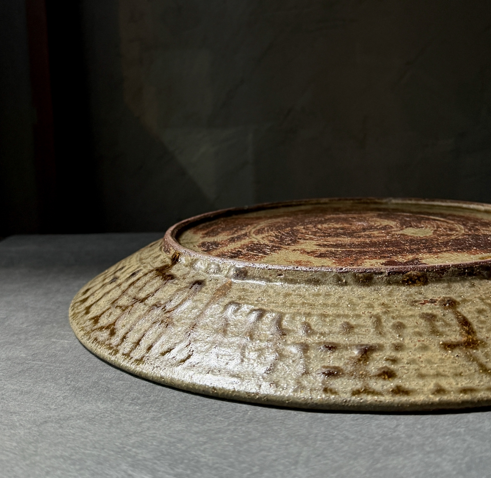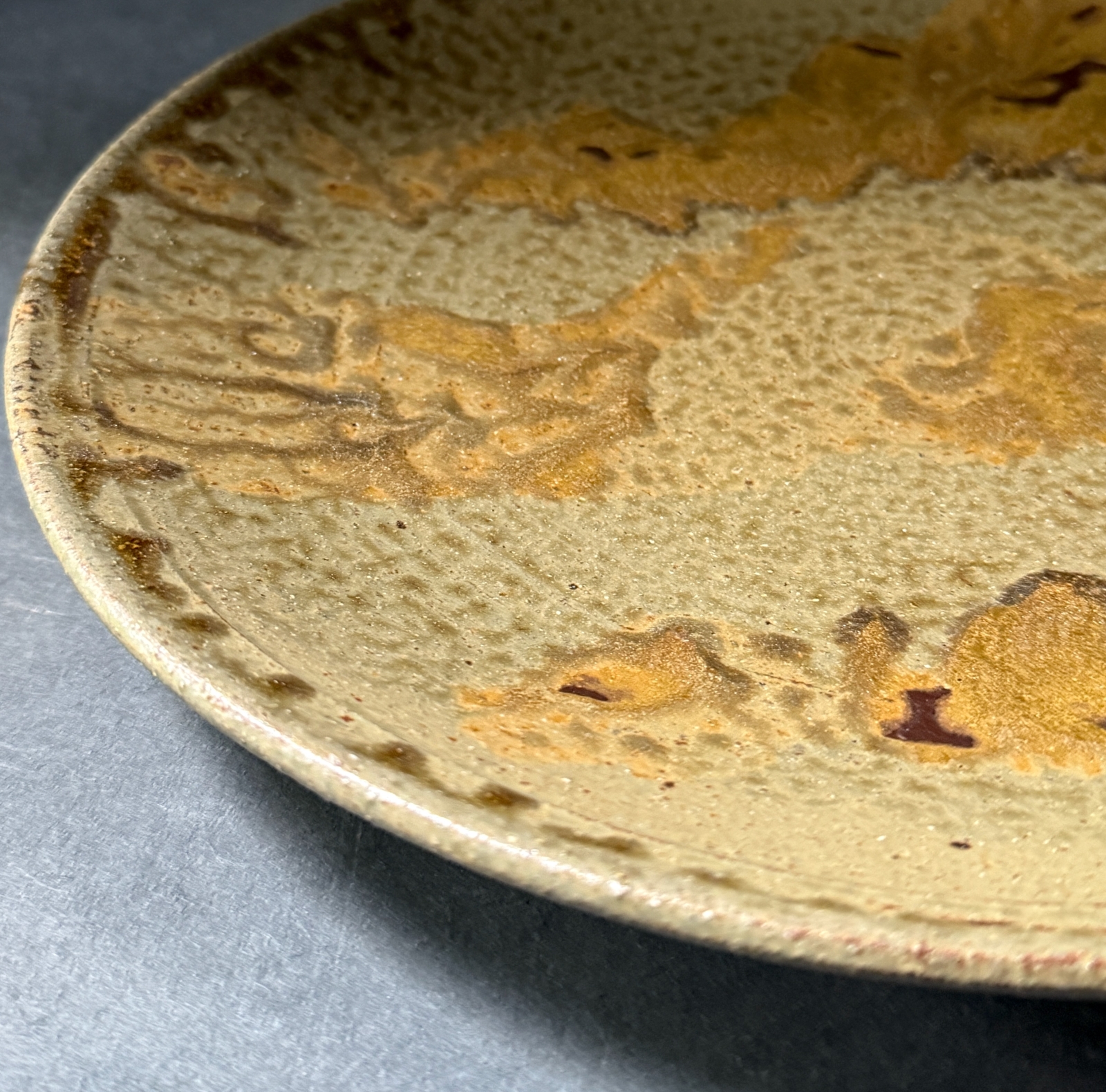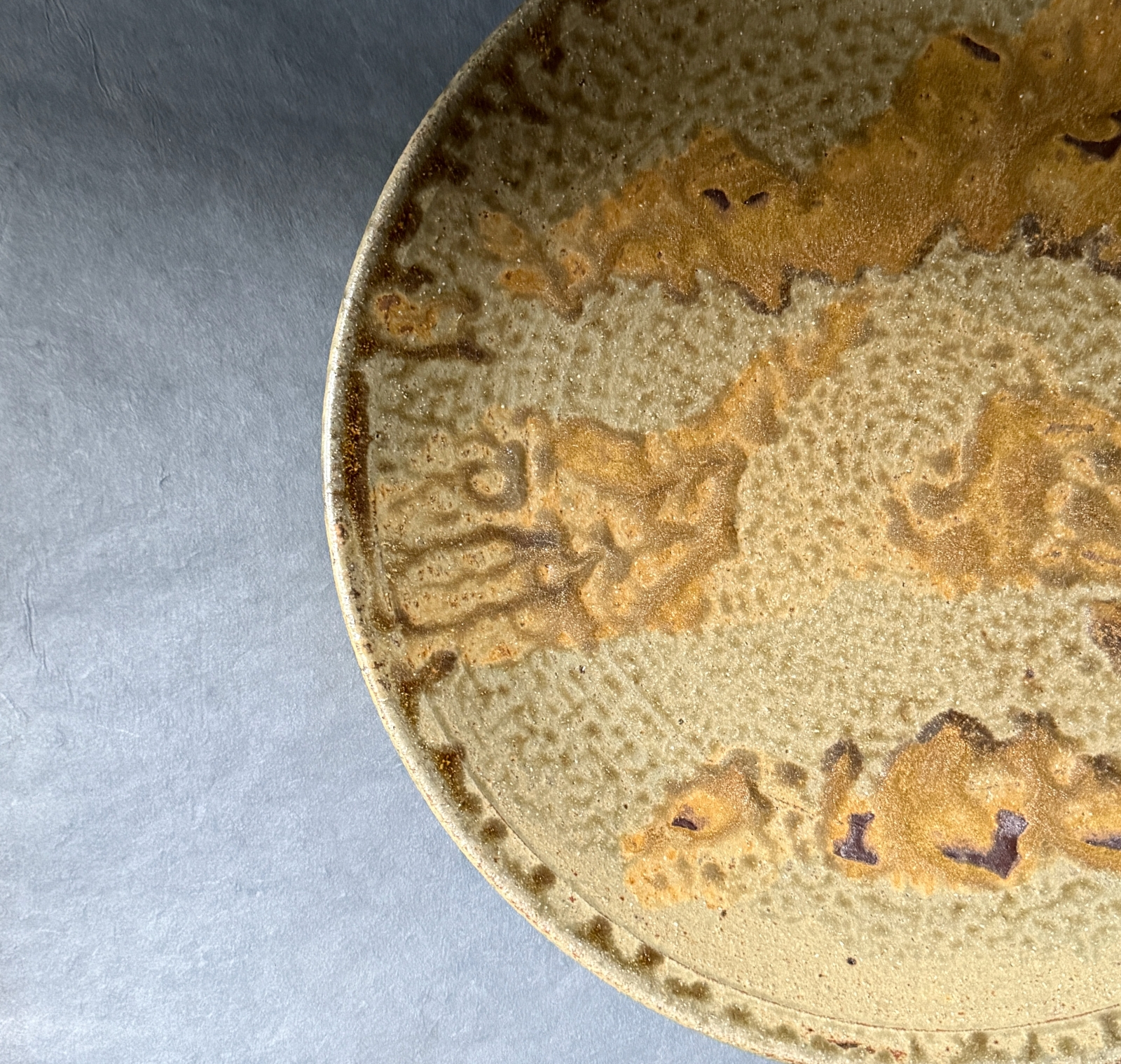 背高泡立草の釉薬で制作された絵付けの大皿。