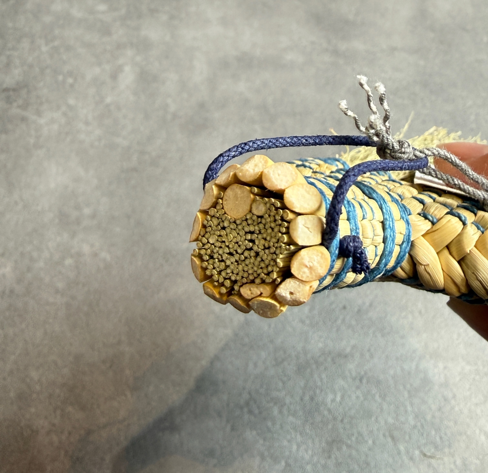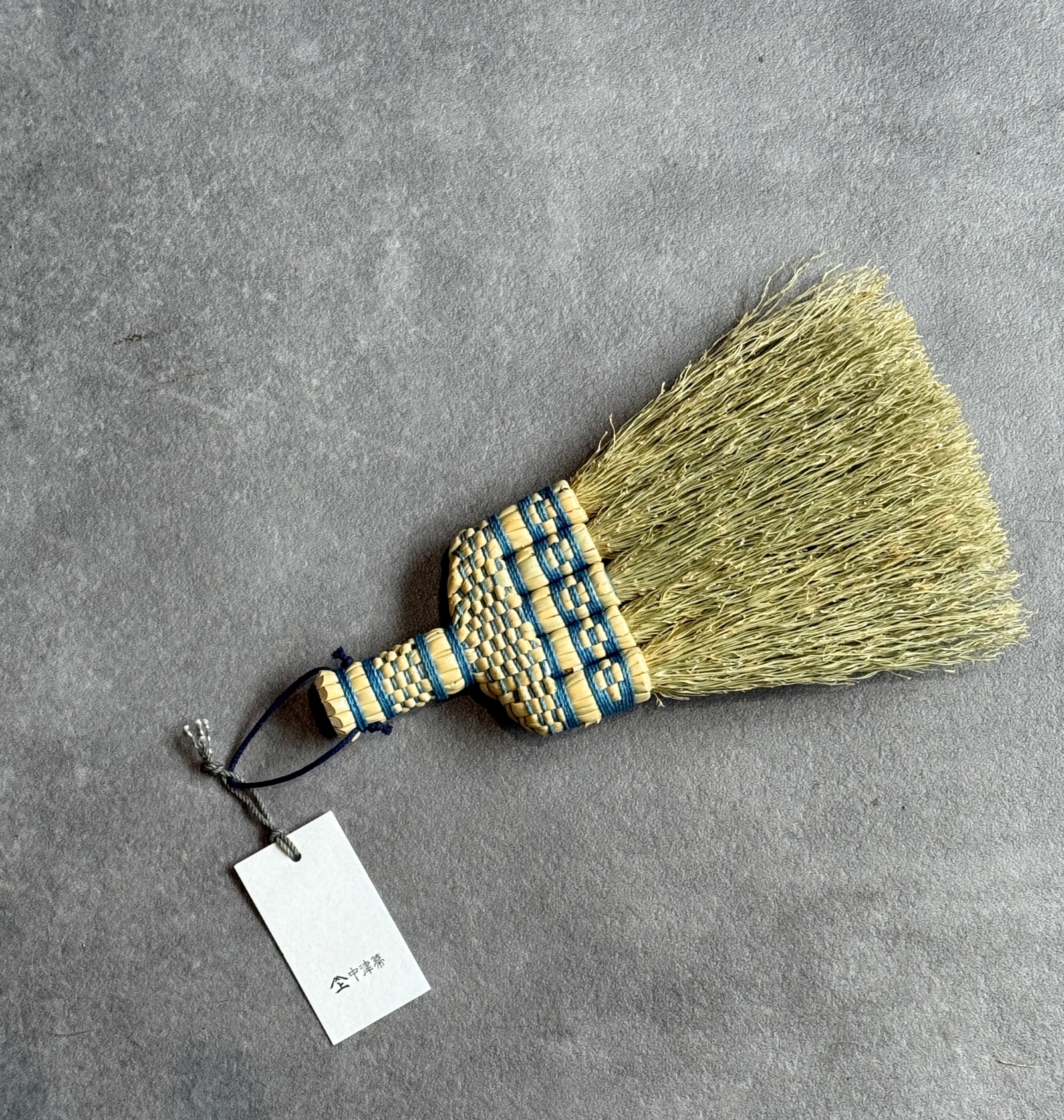 現在の中津箒では、手仕事のらしさややわらかさ、そして綿糸とホウキモロコシの素材感を際立たせるアクセントとして、この伝統的な「紋」を玉に施されています。
