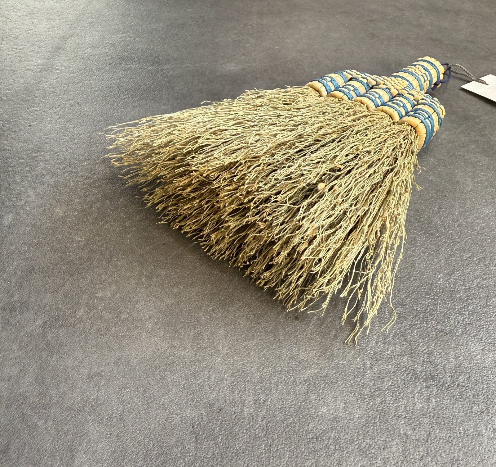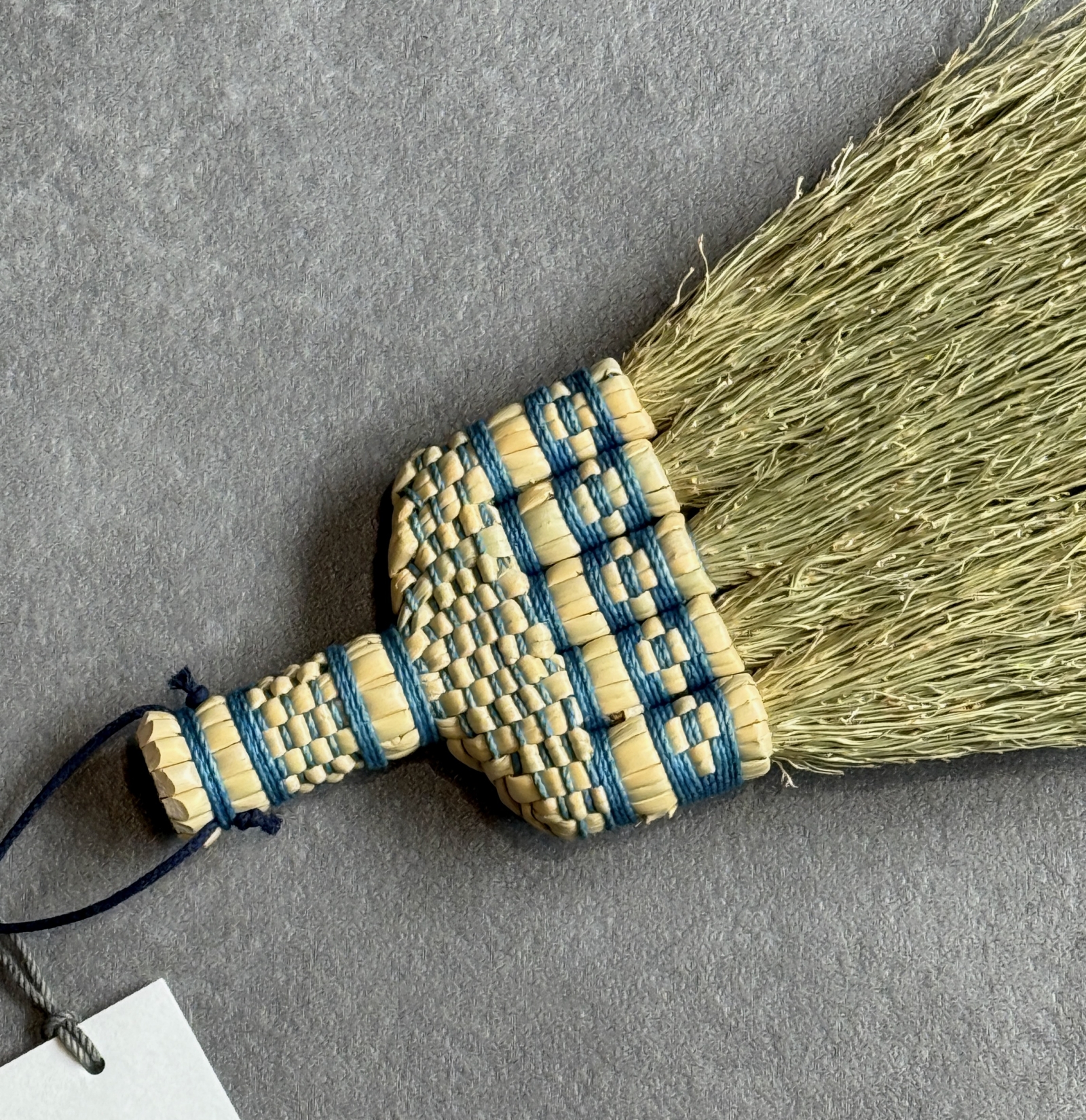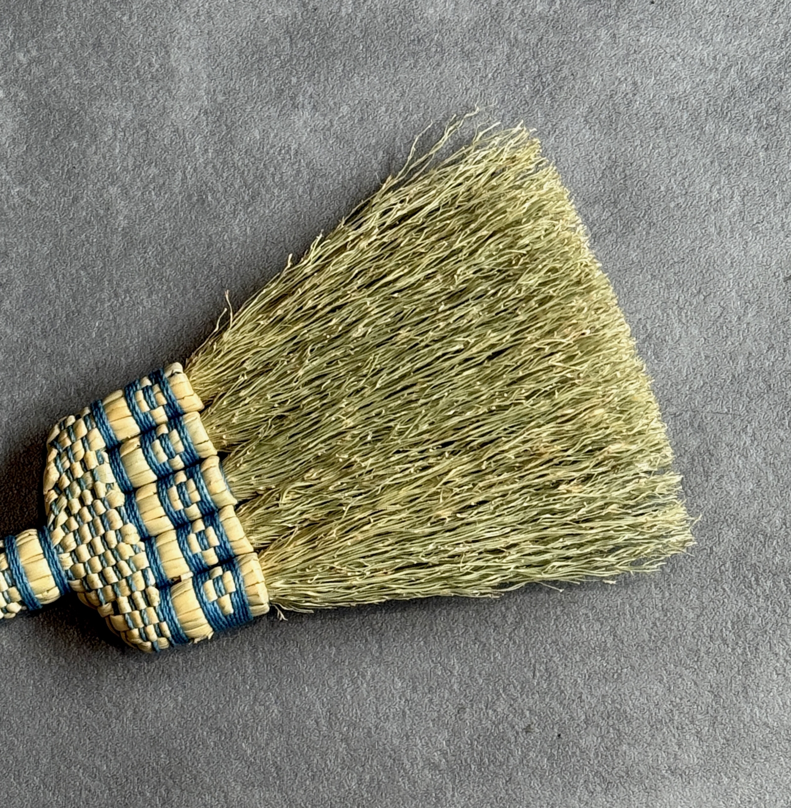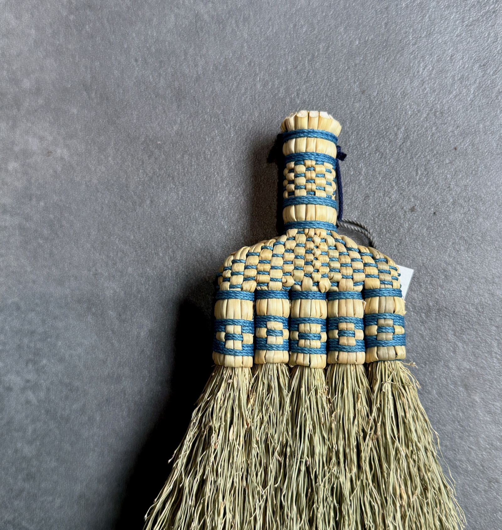 洋服箒の玉と呼ばれる草束の部分に十字に編み出された「紋」は、かつては各地の箒作りで一般的に用いられた装飾で、赤や青といったビビッドな色彩の糸や針金であしらわれるのが普通でした。
