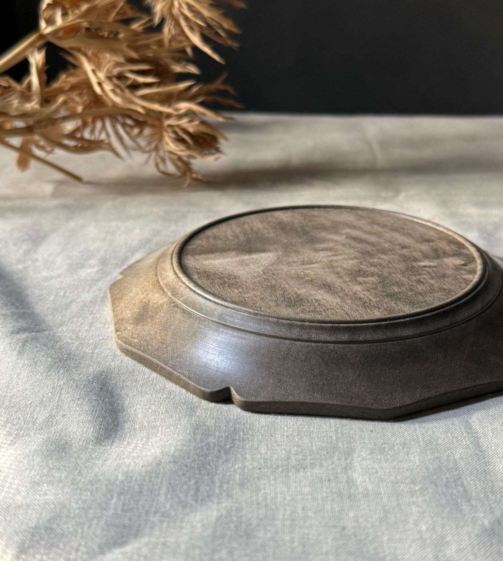 鉄媒染による自然染色や、細やかな凹凸を入れるモールディング加工を施し、アンティーク、古道具を思わせるような器を制作されてる松本 克也さん。