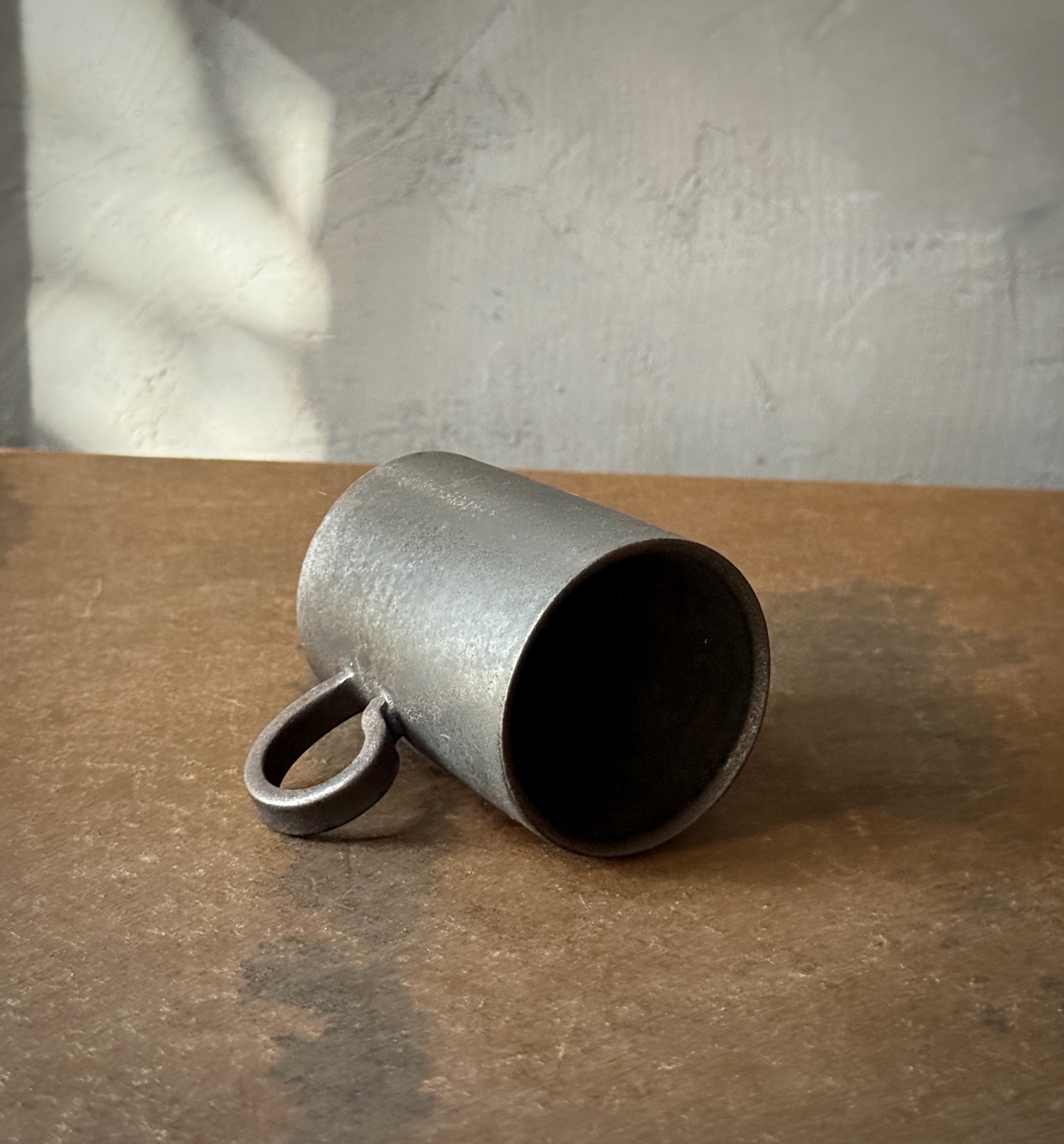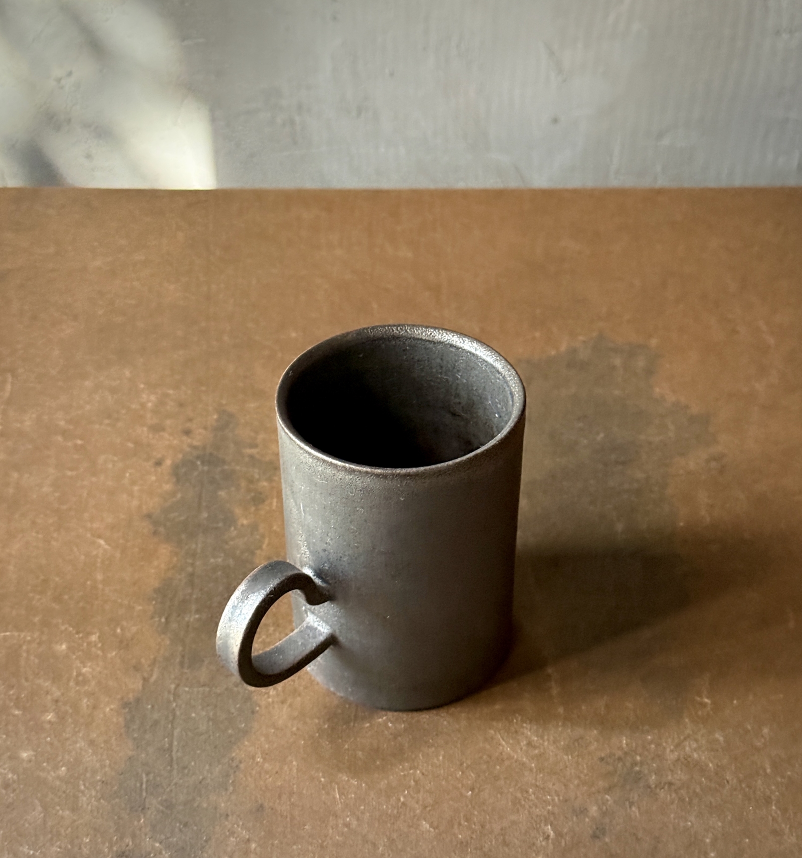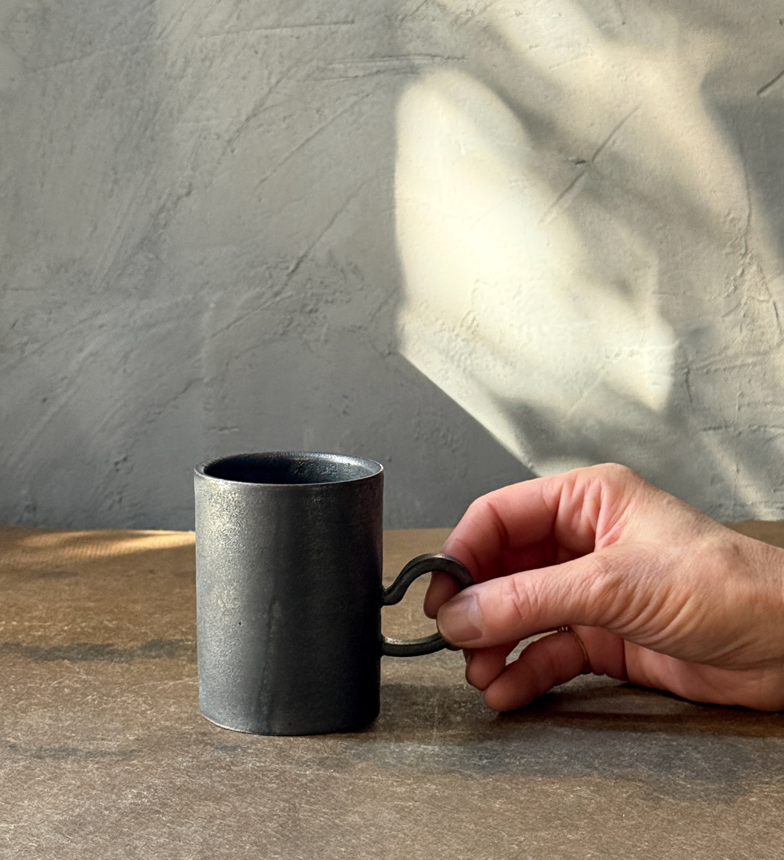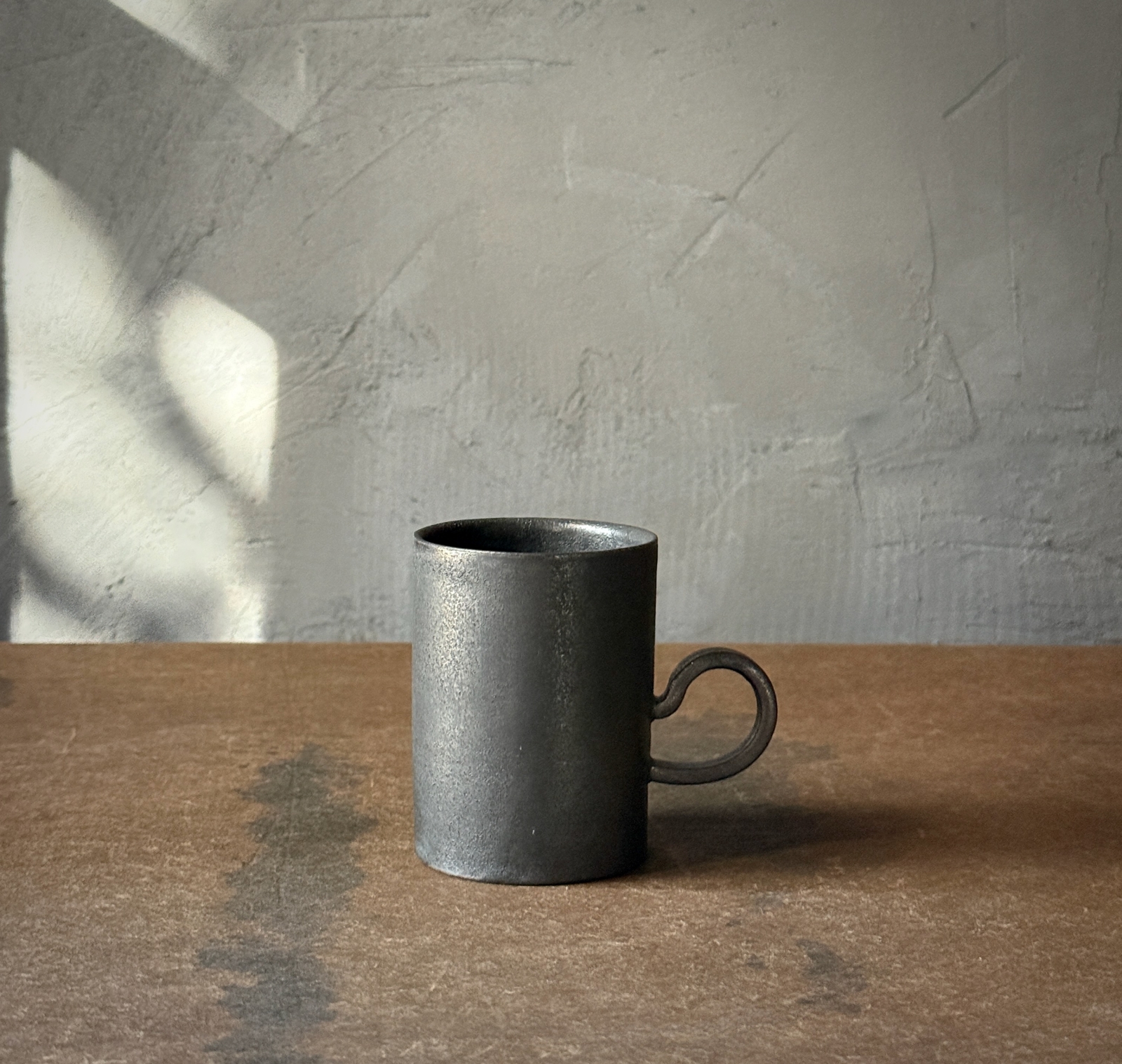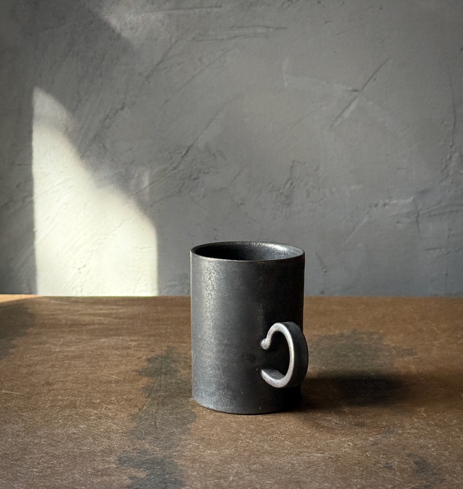 光をまとった鉄釉の光沢と、うちに秘めたような深みある艶が魅力的なカップ。