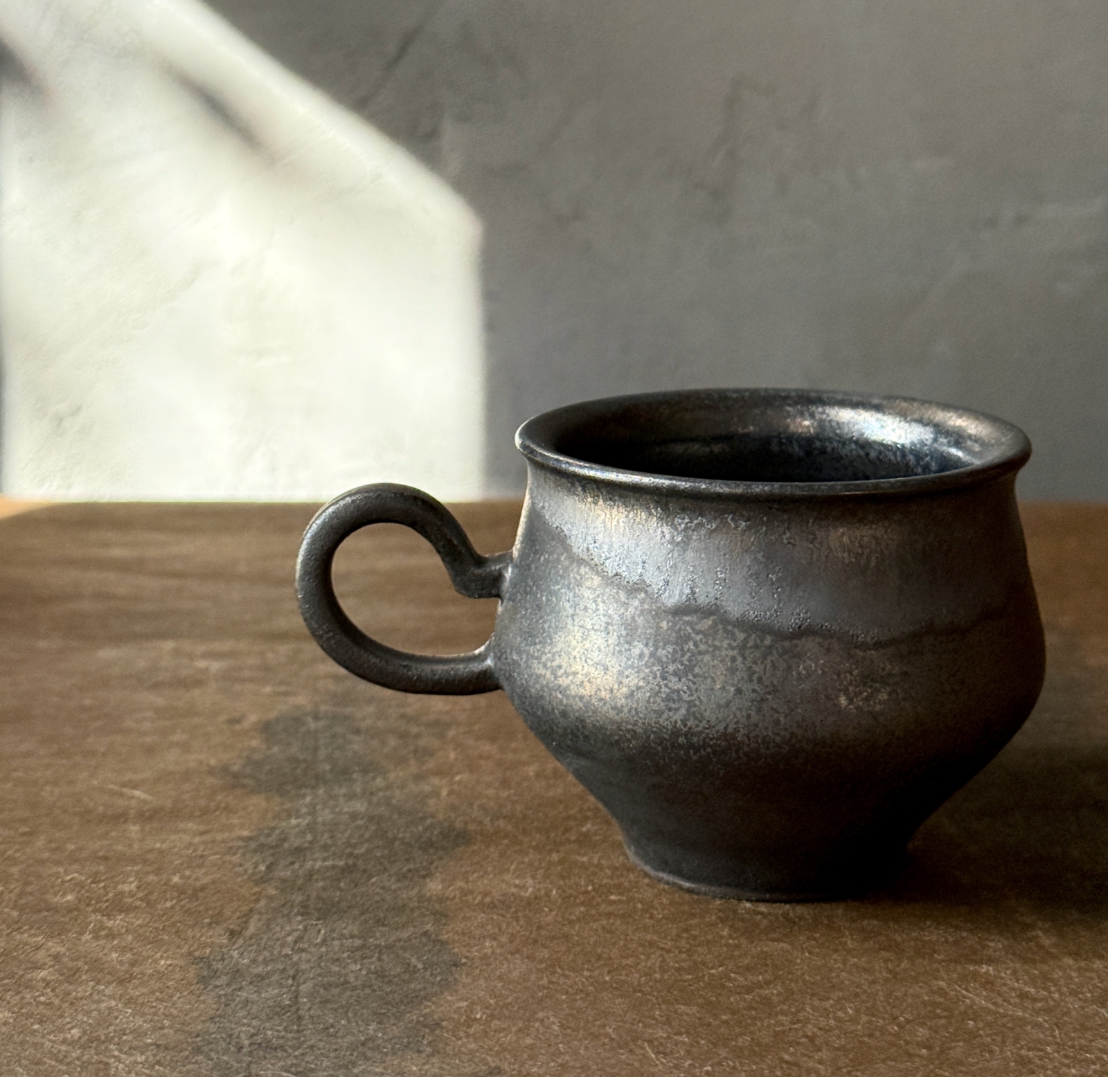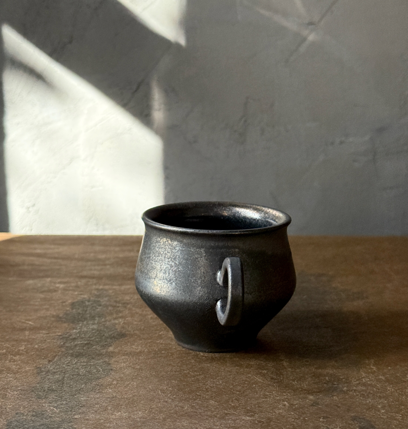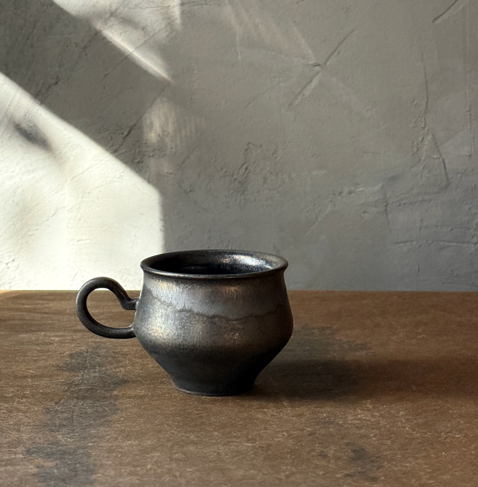 光をまとった鉄釉の光沢と、うちに秘めたような深みある艶が魅力的なカップ。
