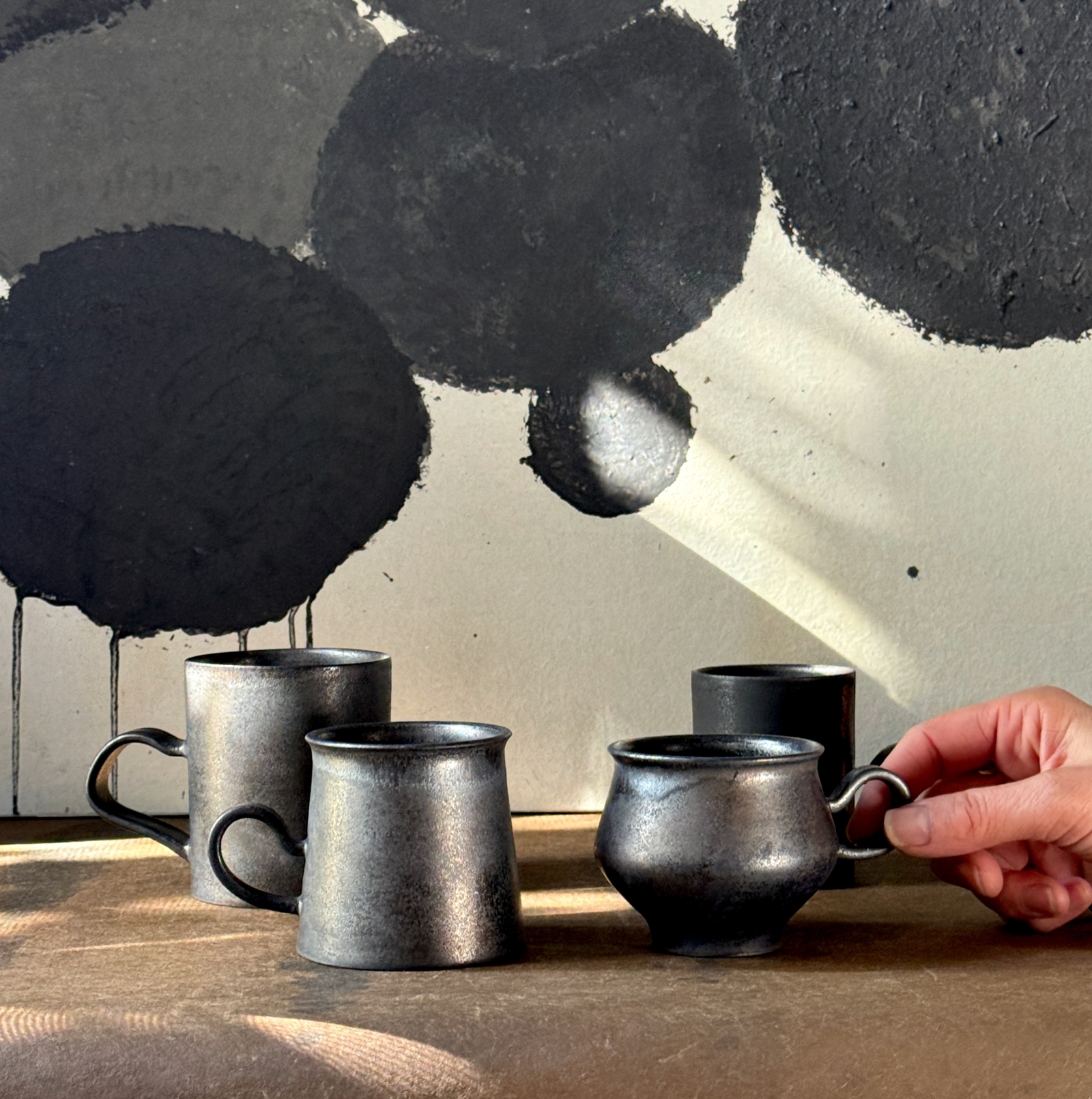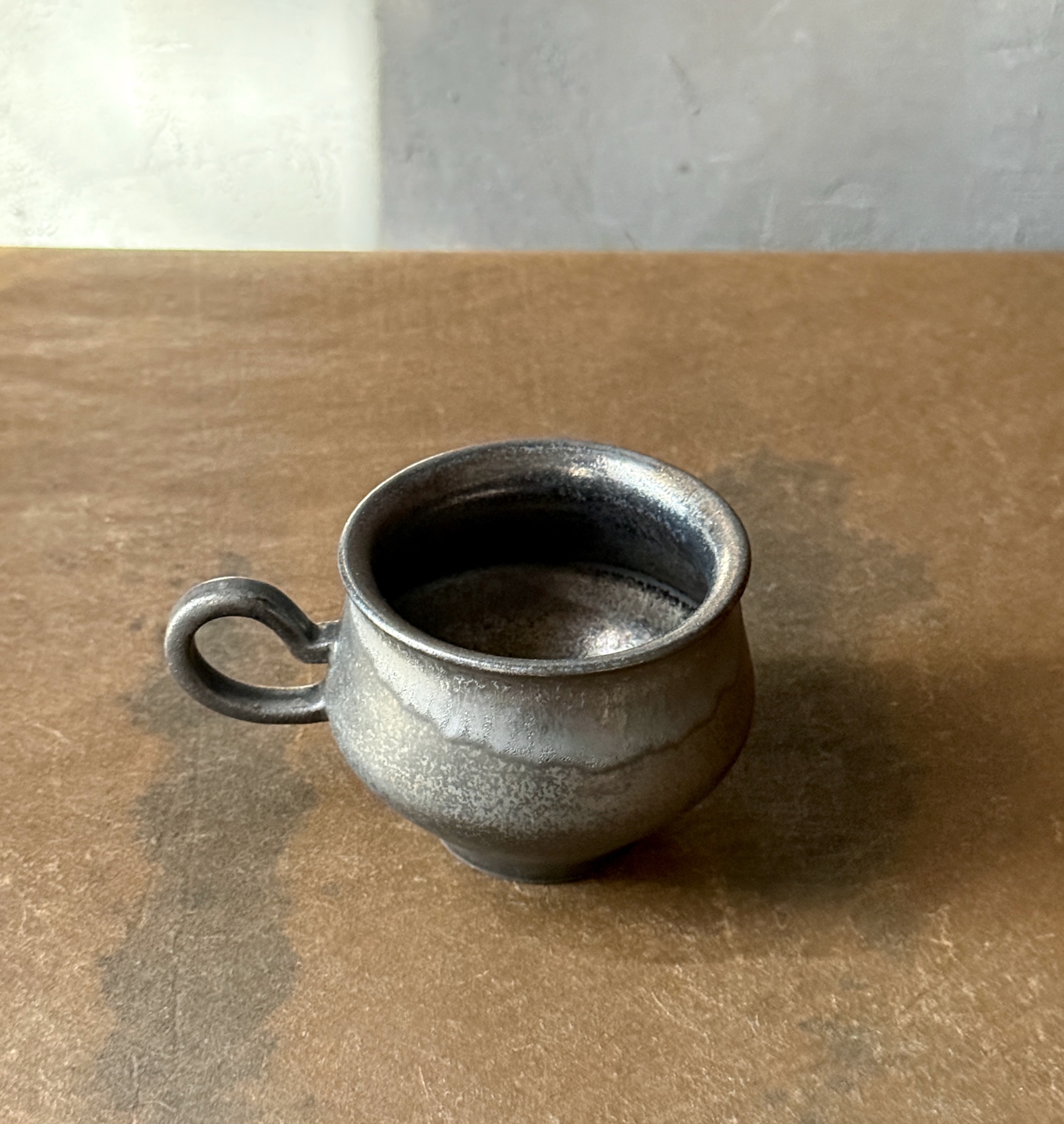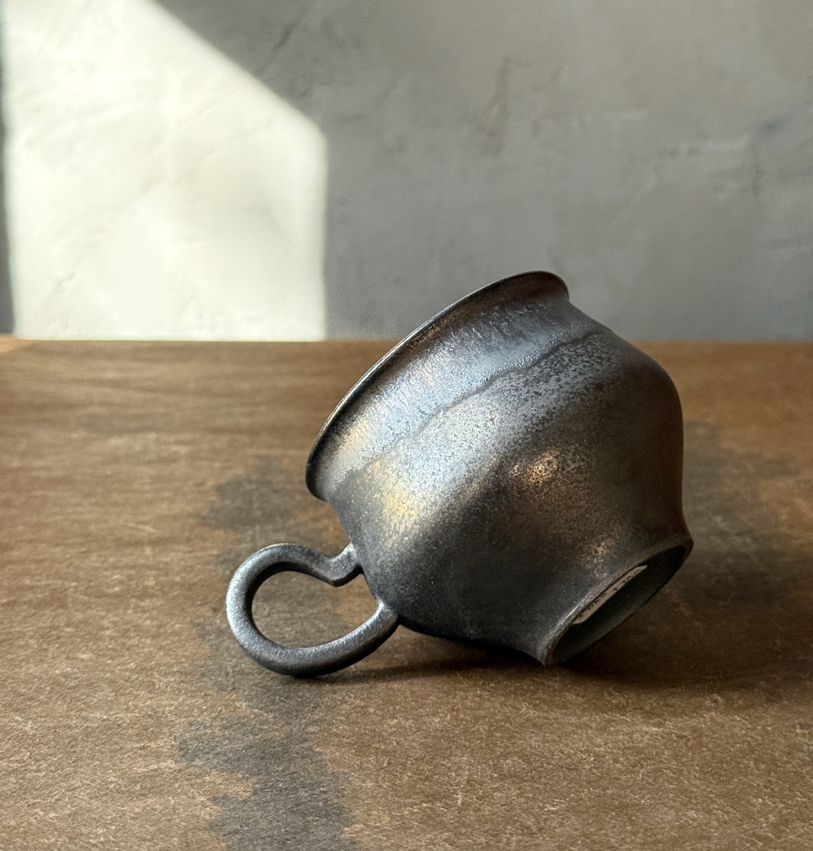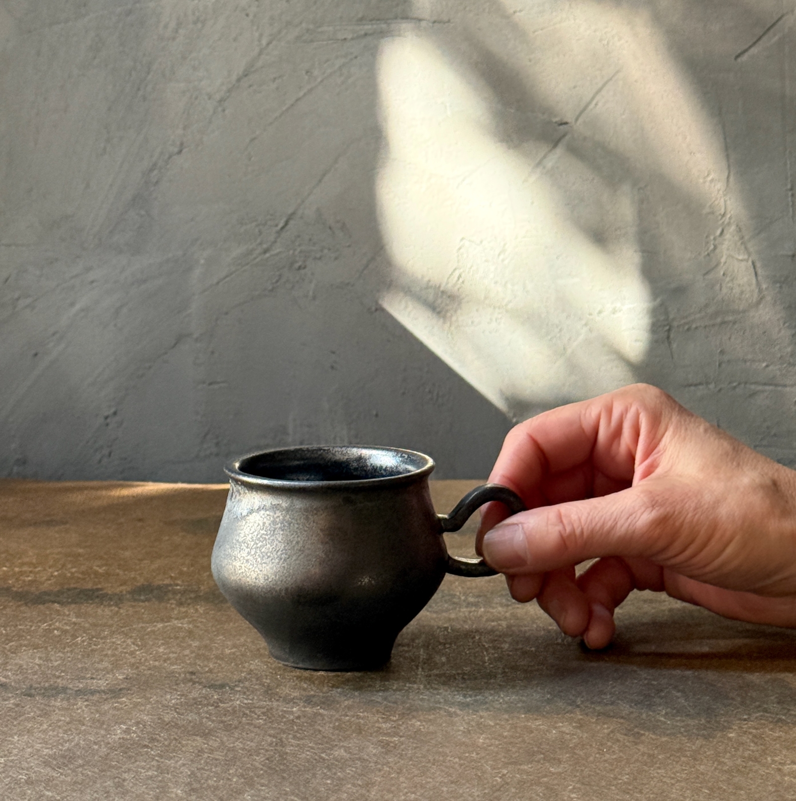 光をまとった鉄釉の光沢と、うちに秘めたような深みある艶が魅力的なカップ。