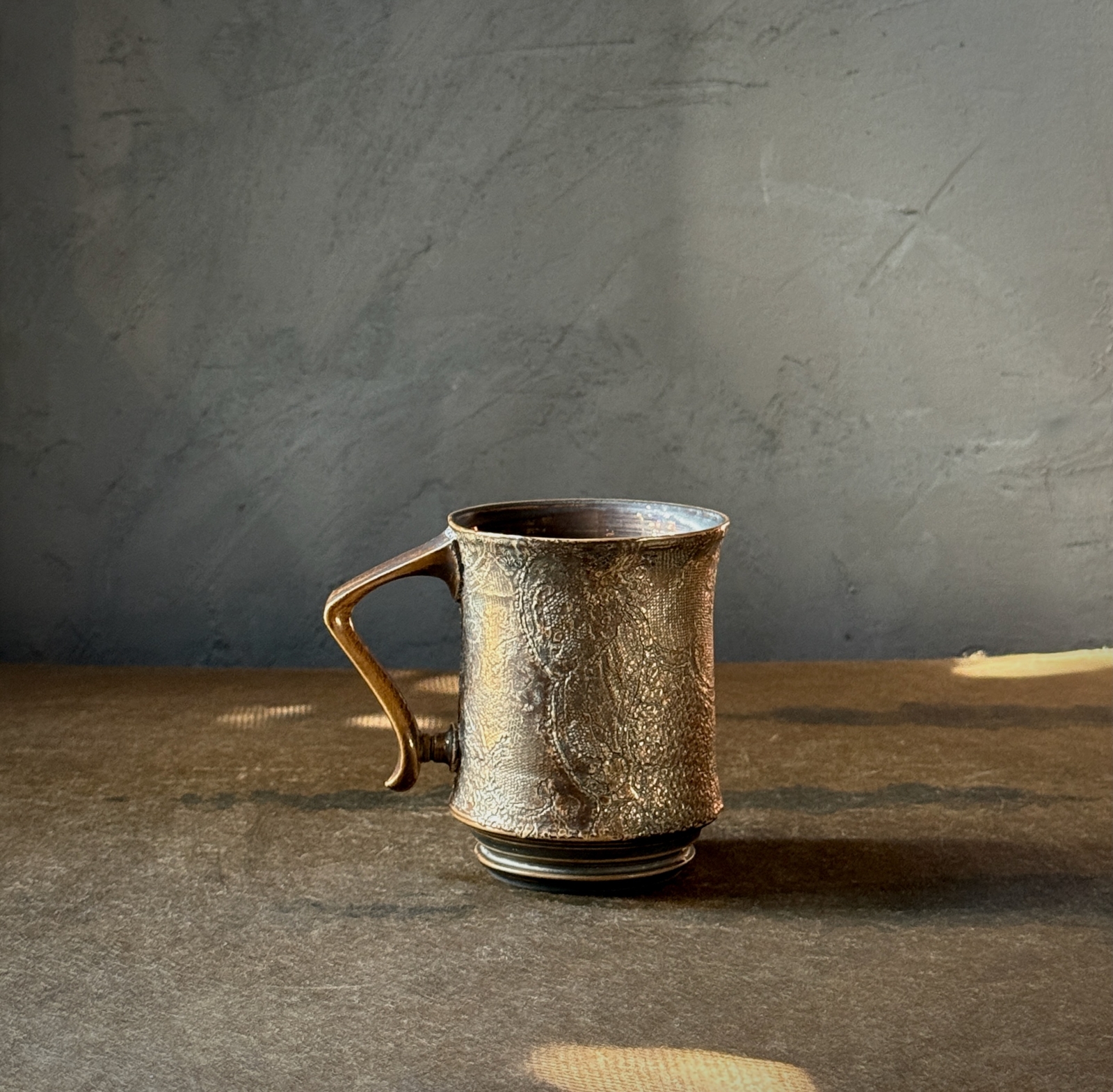 その質感と色合い、模様による陰影が相まって独特な雰囲気漂う作品になっております。