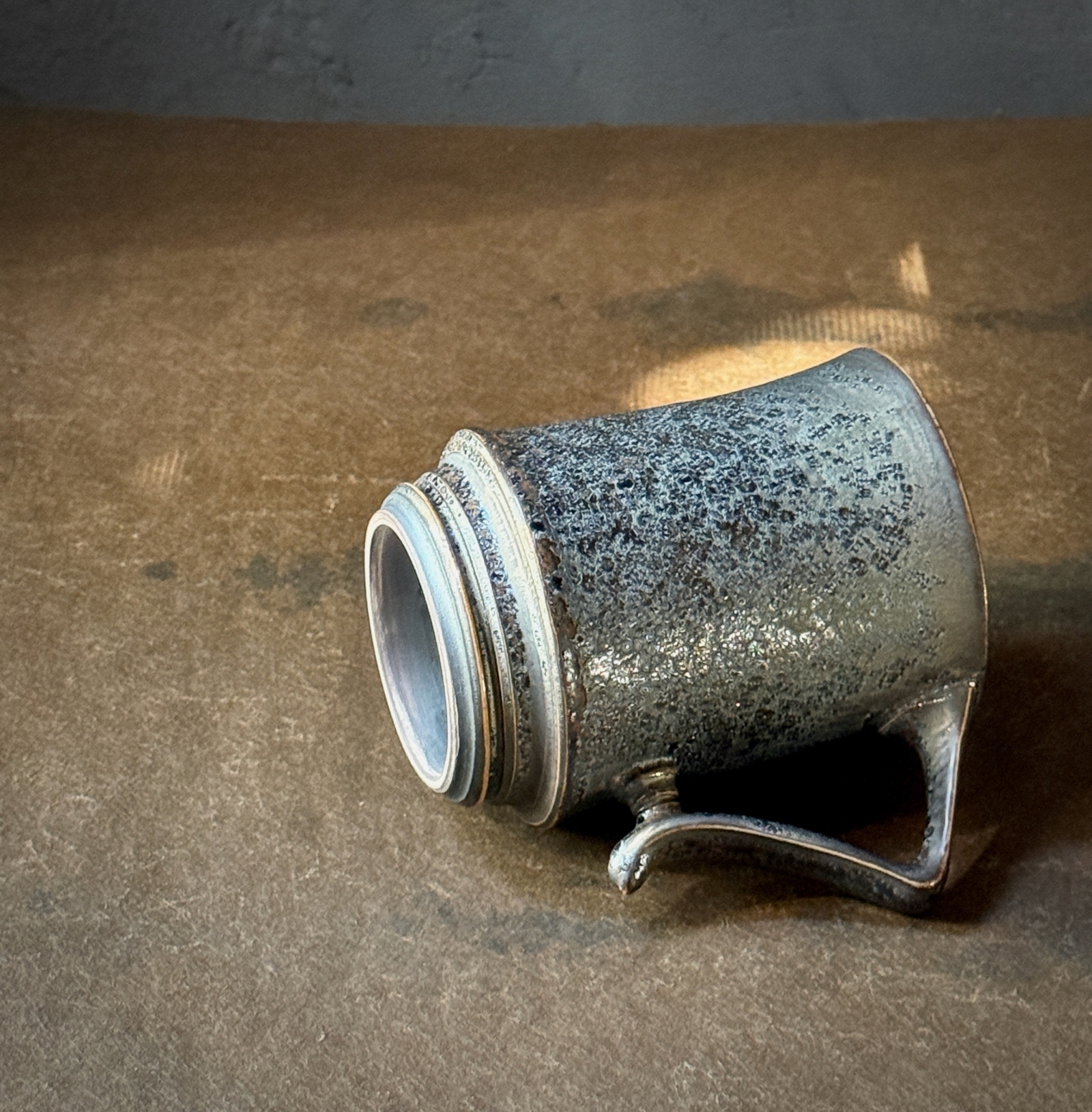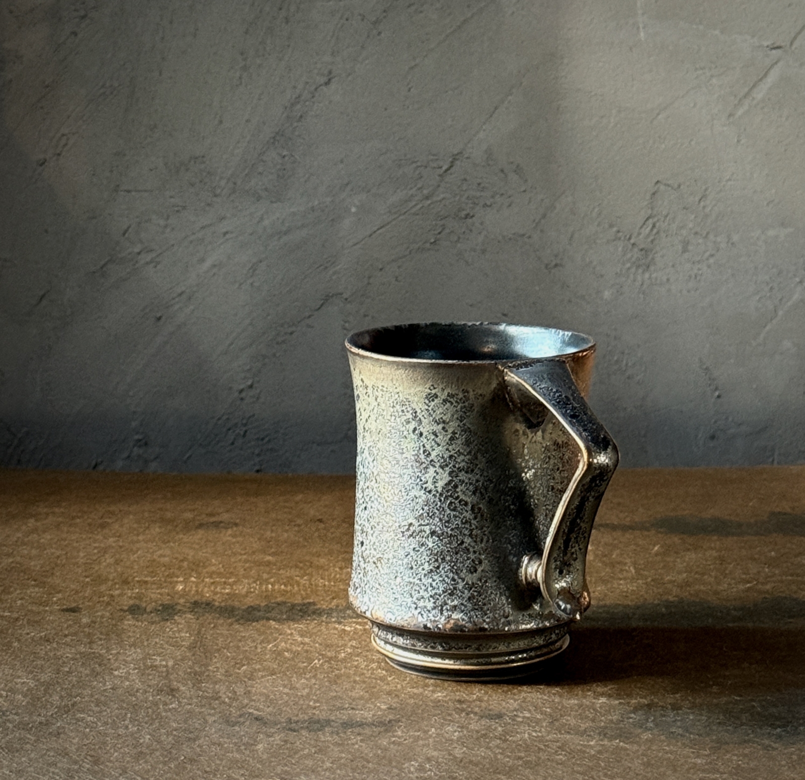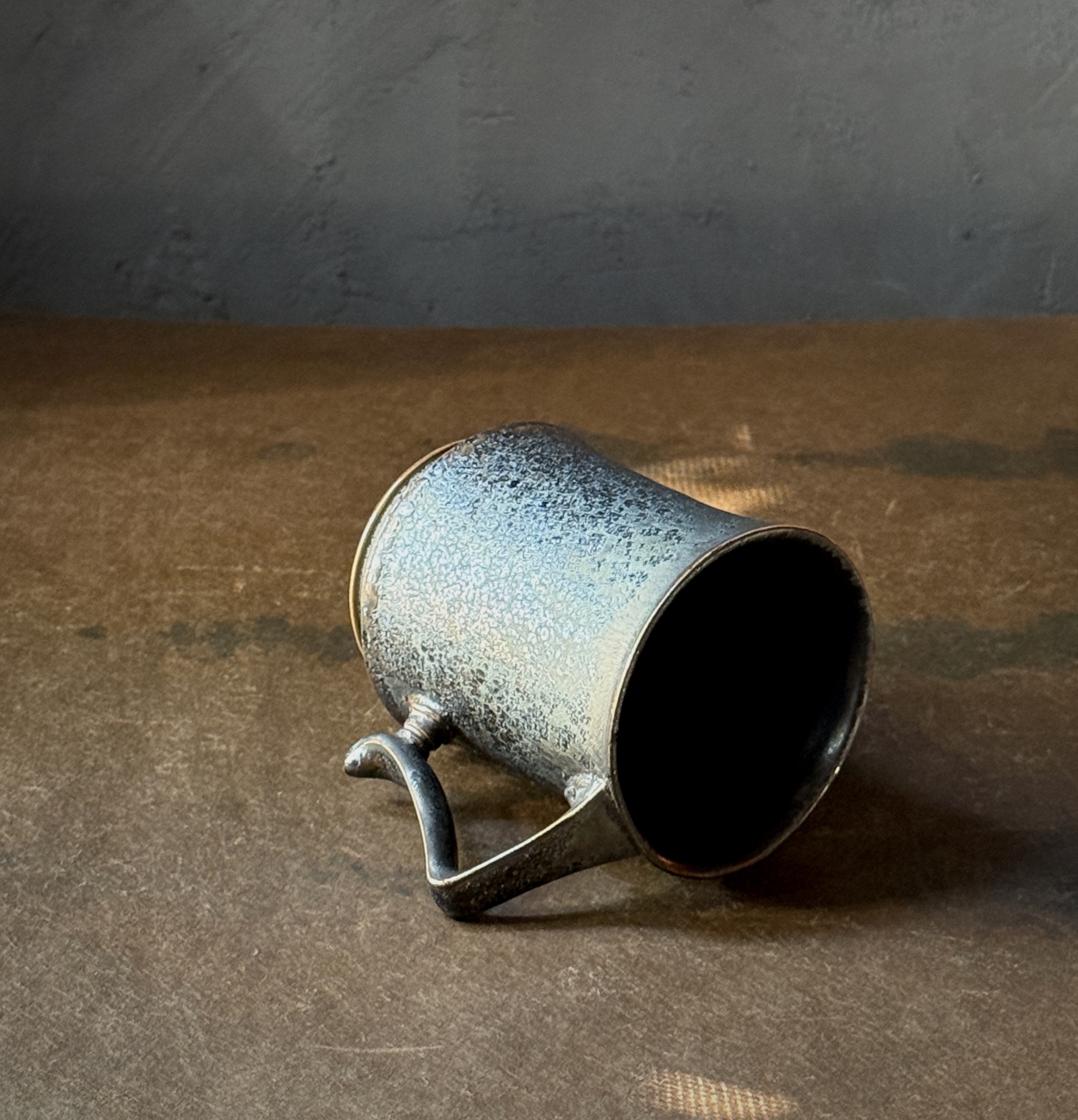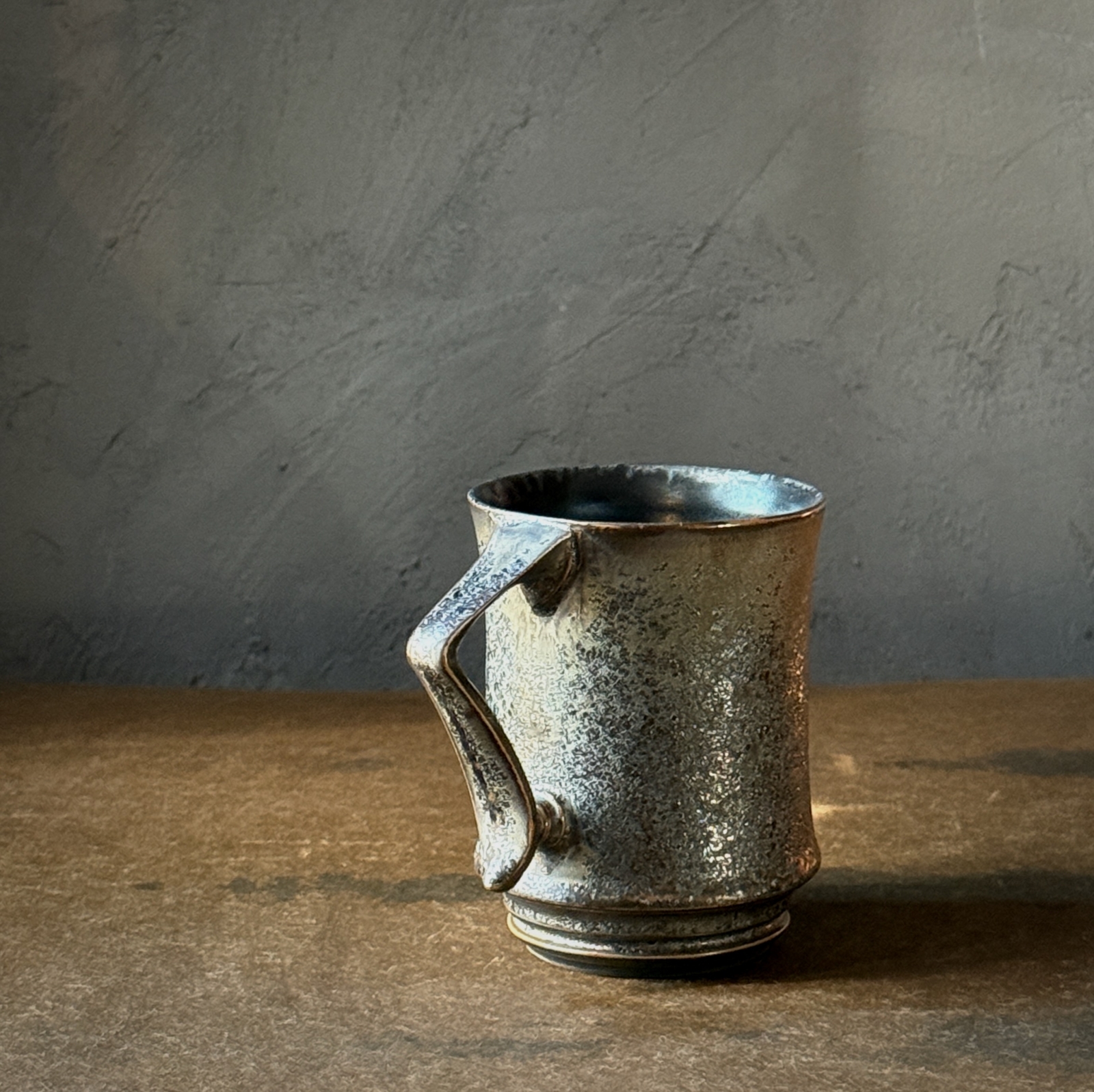 鉄を使用した釉薬でレオパードを表現されており、アンティークのような重厚な佇まいが印象的なマグカップ。
