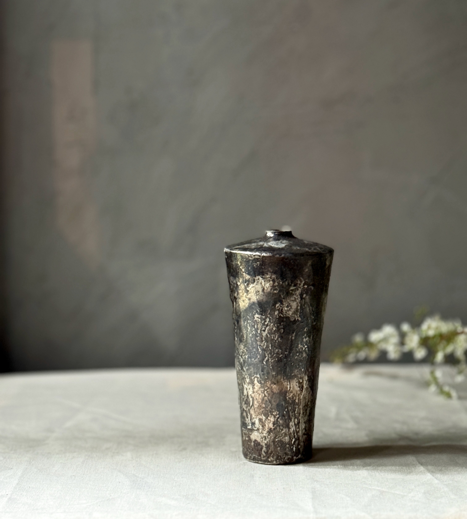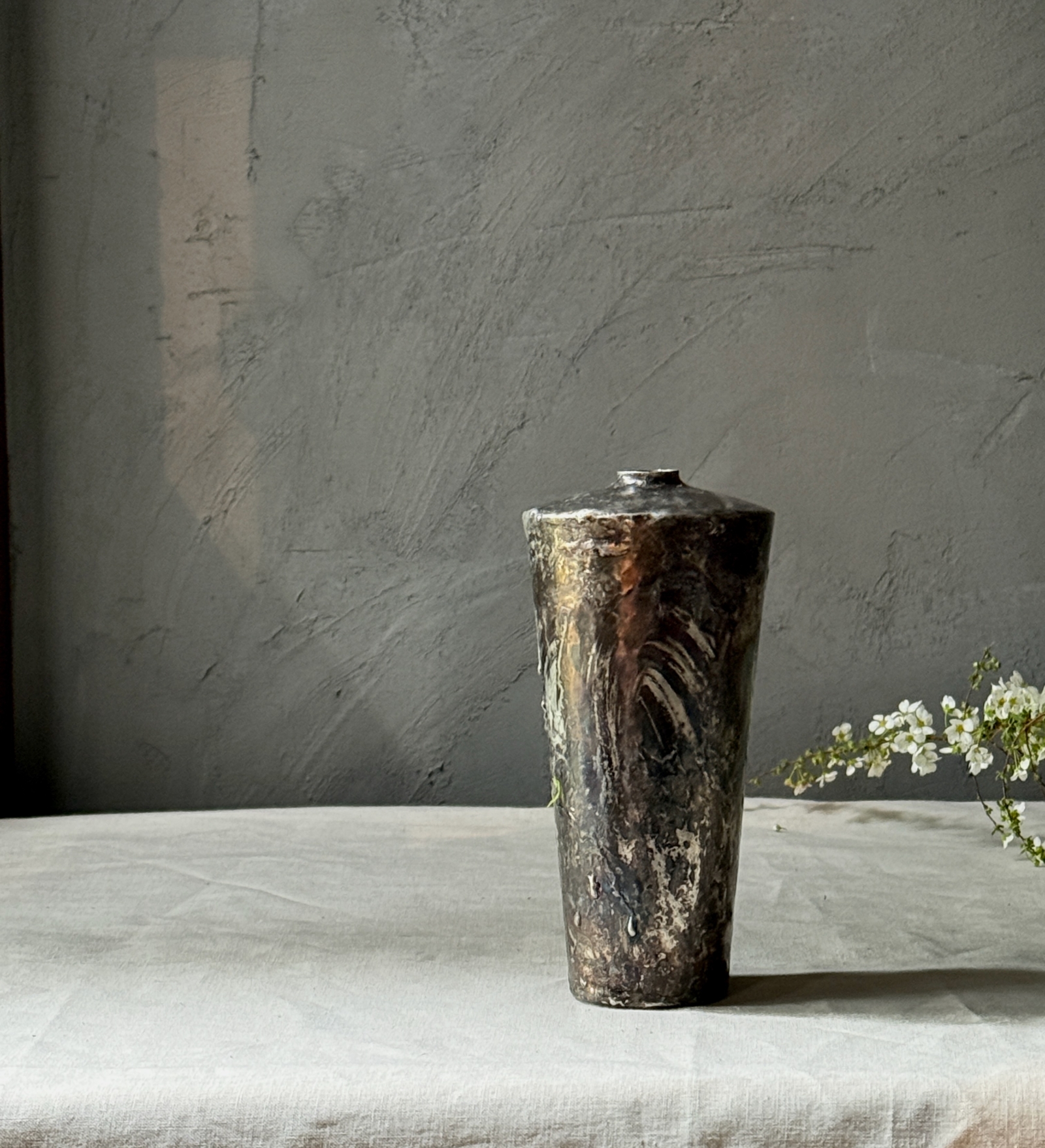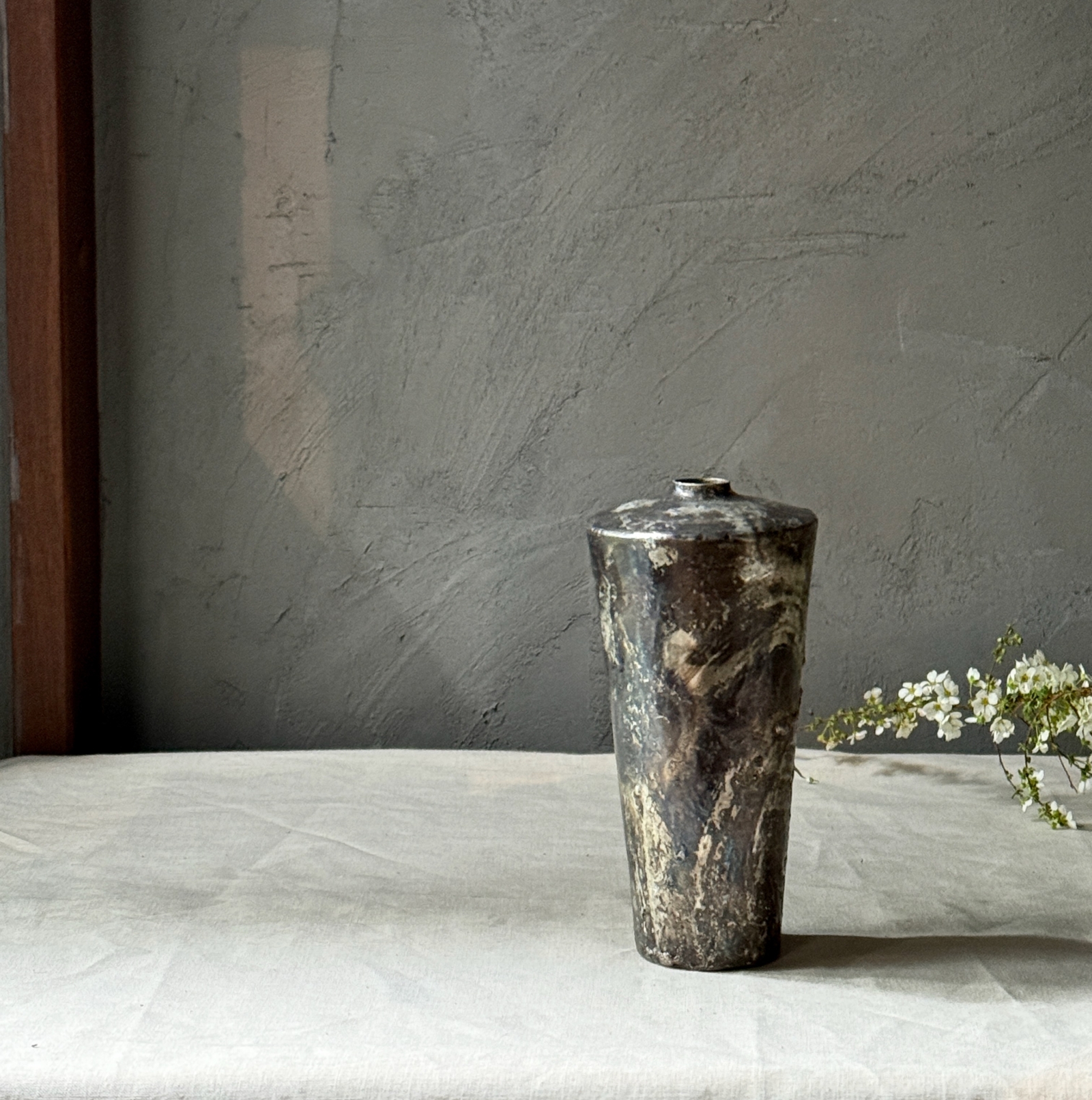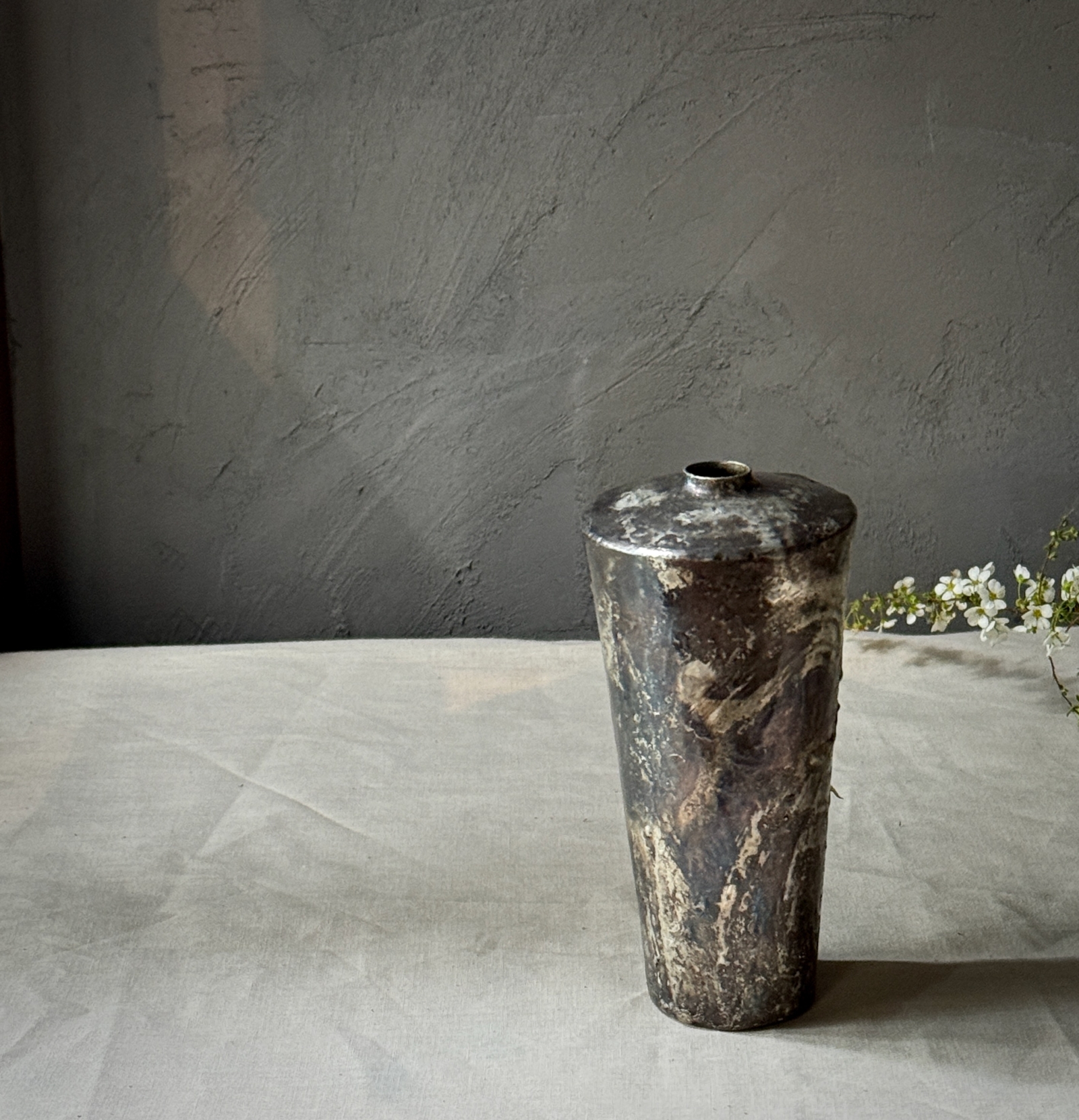 錫引きという一般的な技法を、自身で研究され、加熱など様々な要因を持って複雑な模様を出し、藤田永子さんの独特の景色が広がる銅と錫の花器。