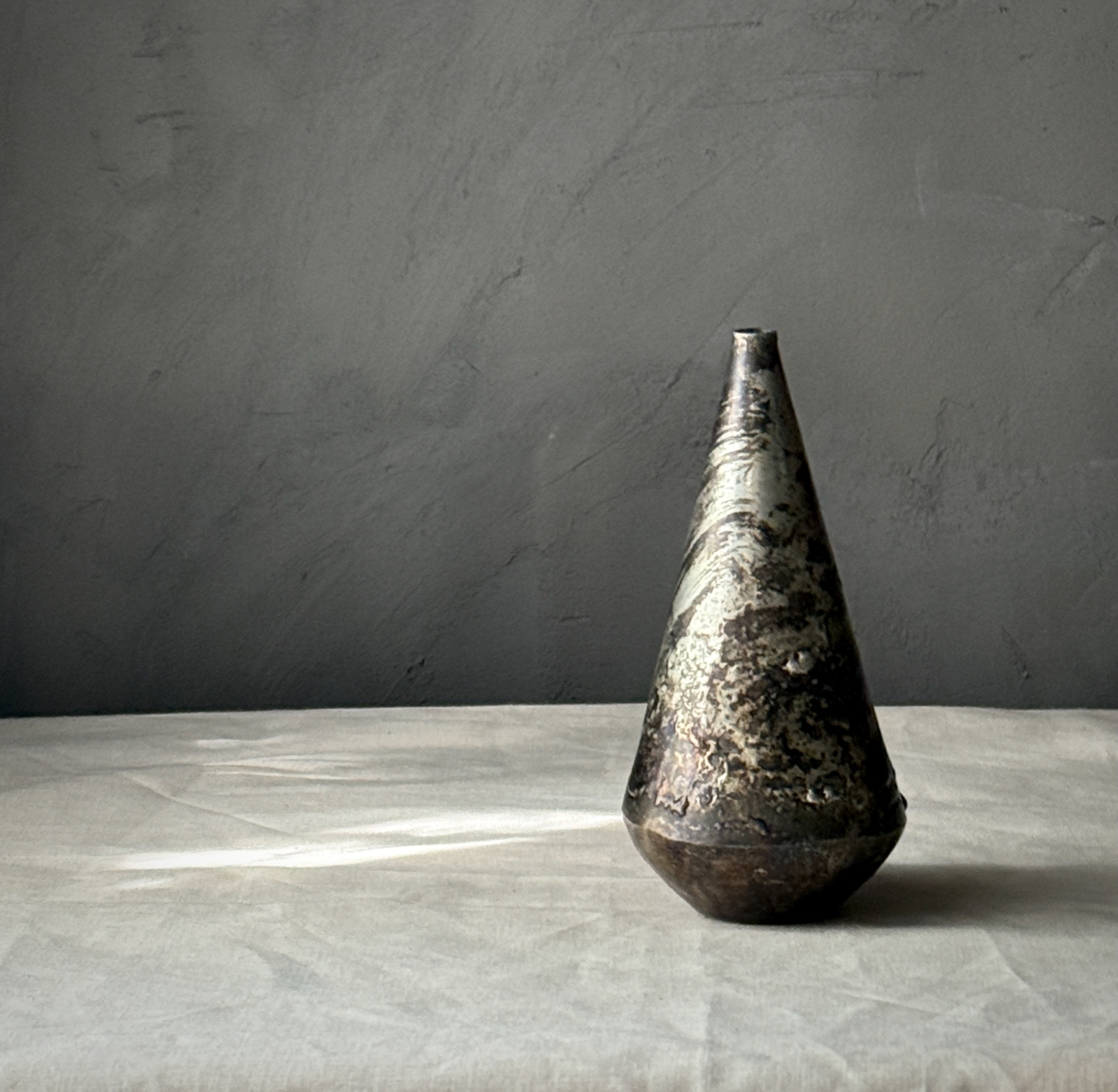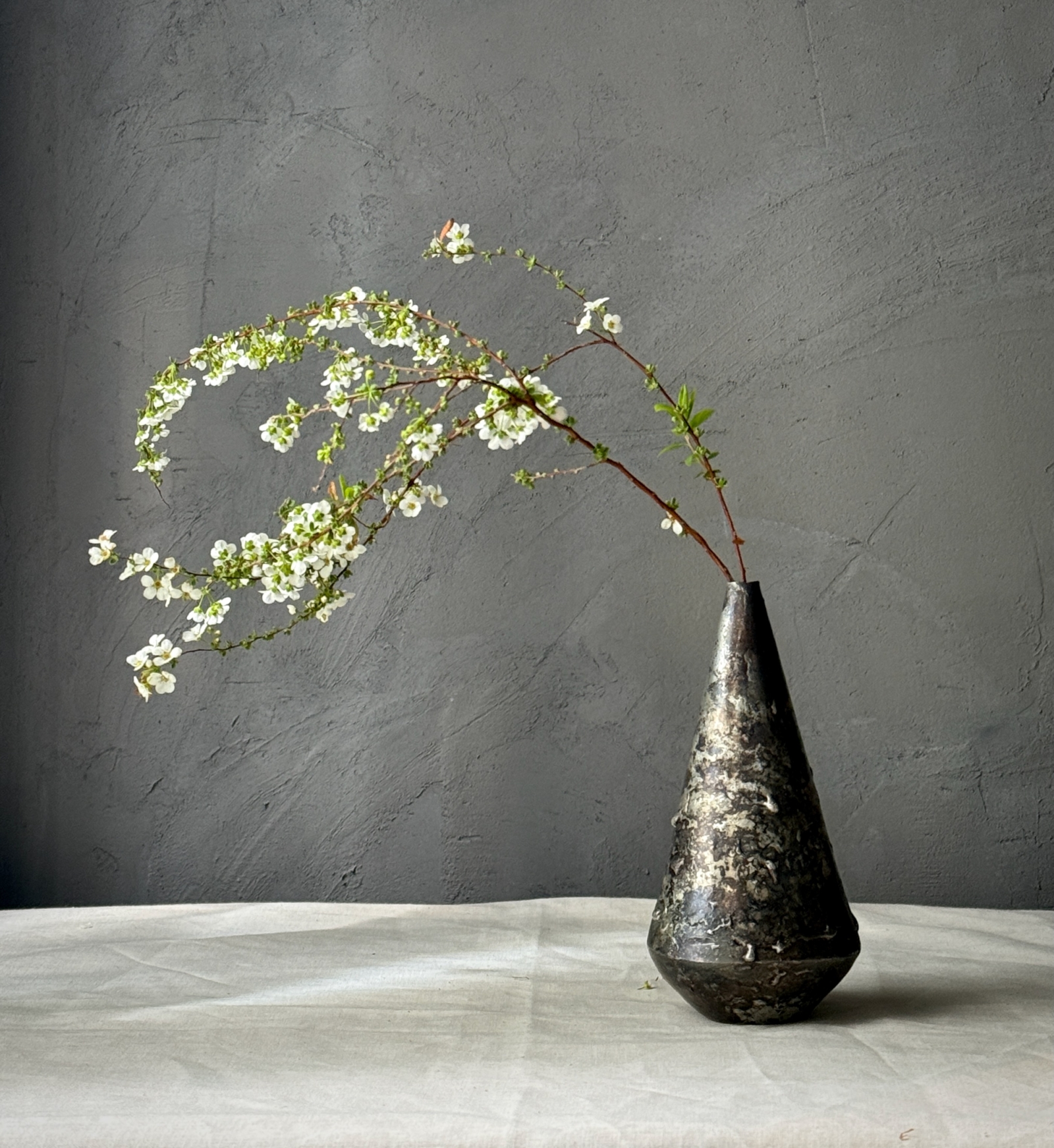 錫引きという一般的な技法を、自身で研究され、加熱など様々な要因を持って複雑な模様を出し、藤田永子さんの独特の景色が広がる銅と錫の花器。