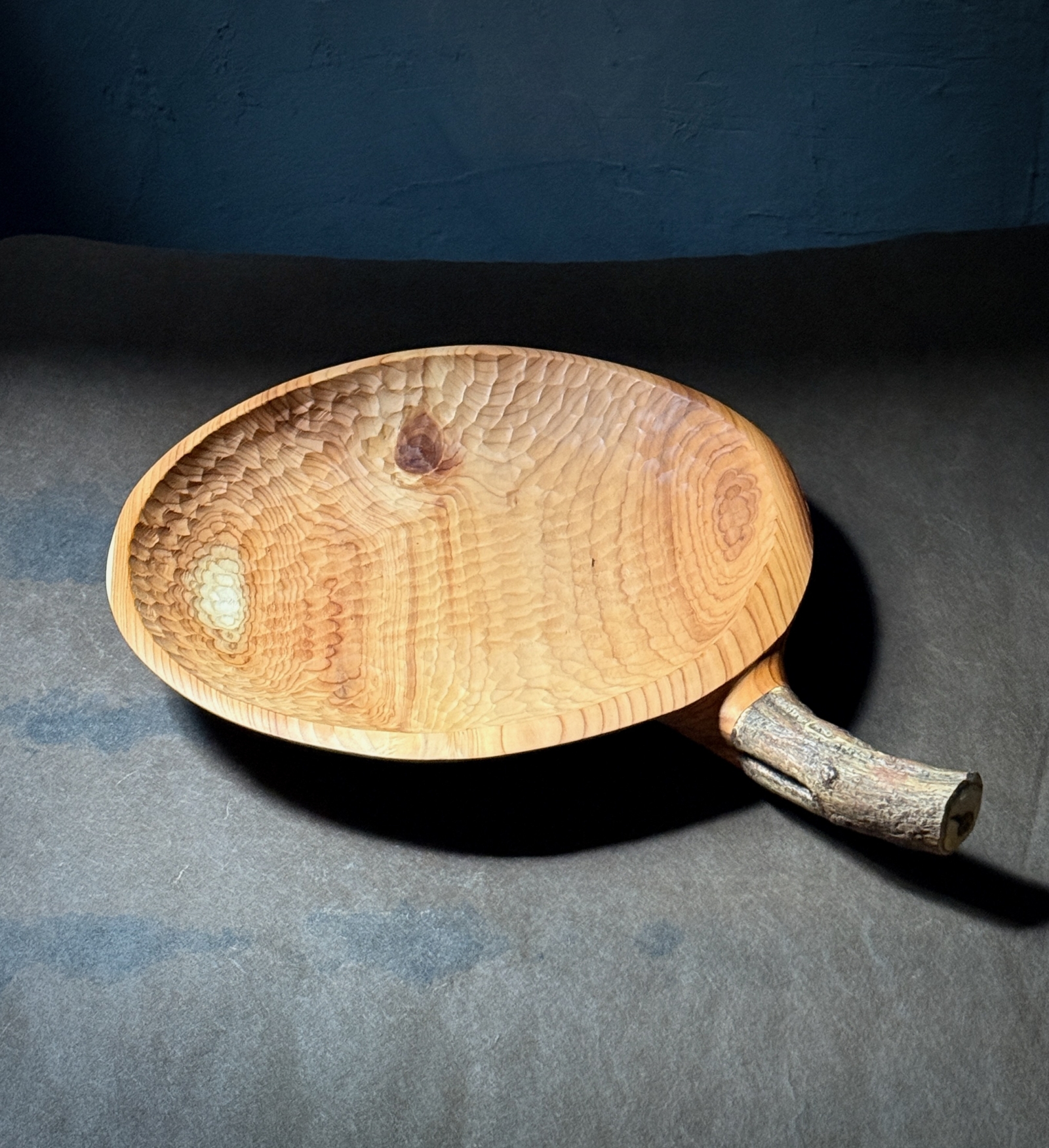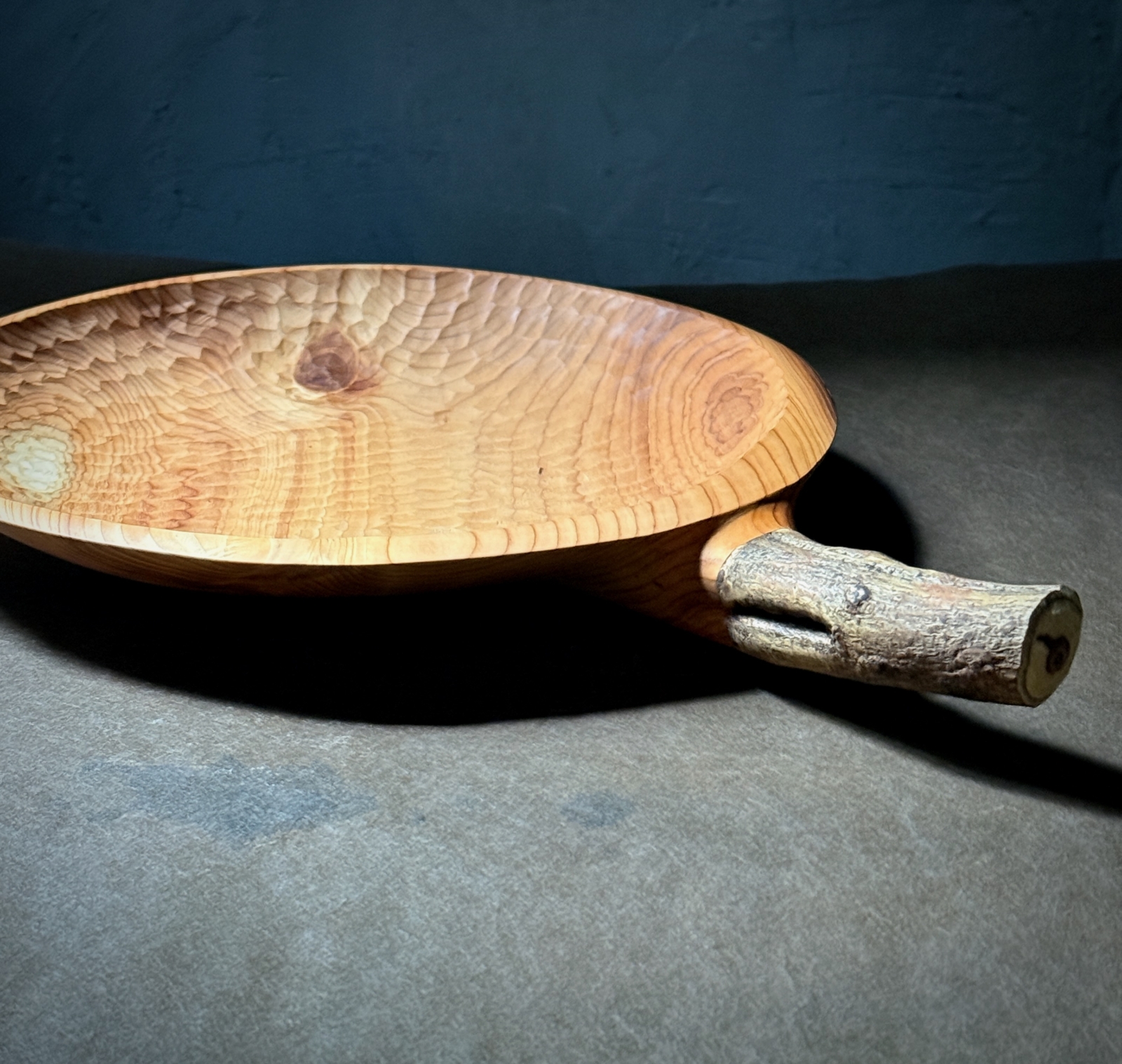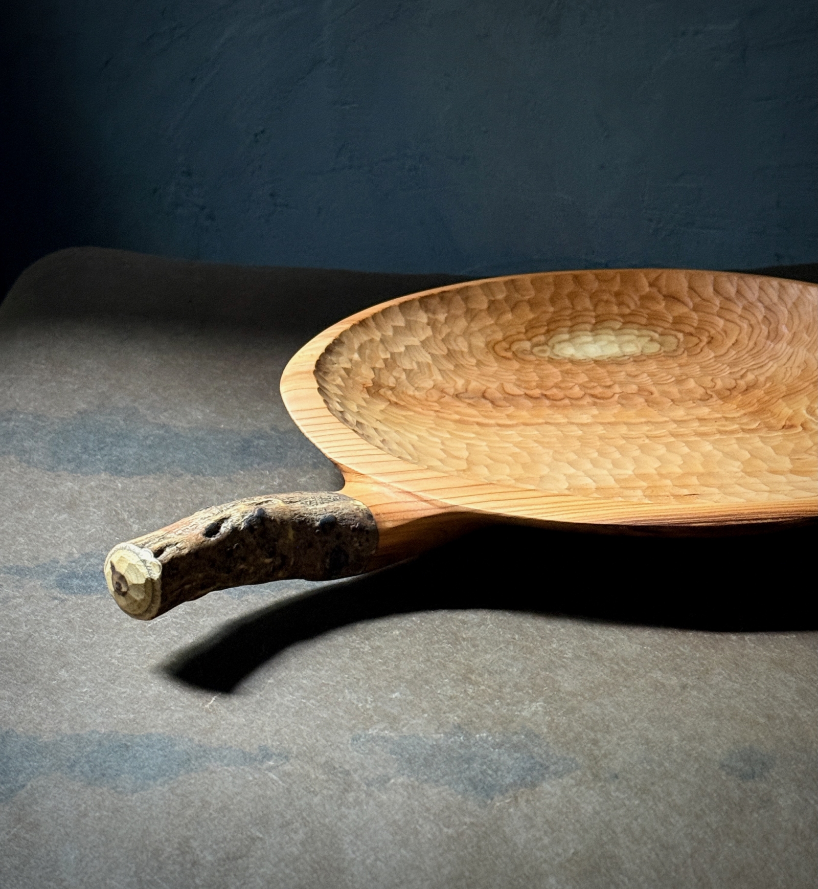 最後の仕上げの手仕事で刻まれた跡によるリズミカルな陰影と手に馴染む「木の枝」の持ち手が、穏やかな存在感をもたらします。