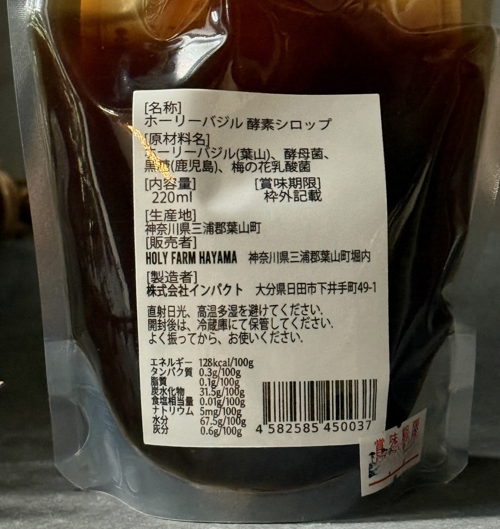 [ 原材料名 ] ホーリーバジル・黒糖・酵母菌・梅の花乳酸菌